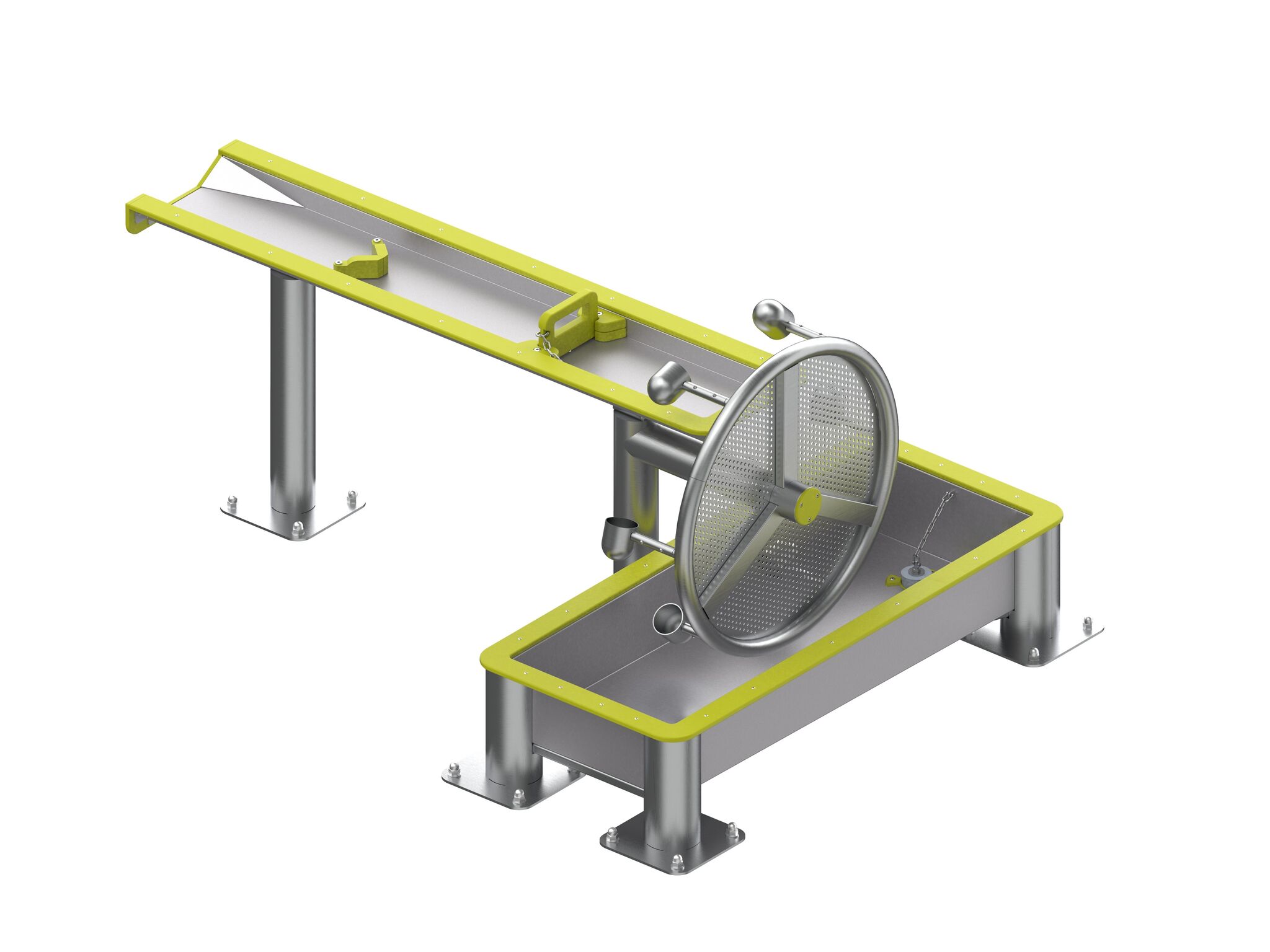 Sestavu tvoří vyvýšený nerezový žlab navazující na spodní vanu, doplněný o otočné perforované vodní kolo, přepážky a regulační prvky pro usměrňování toku vody. Děti mohou sledovat proudění vody, měnit její směr, regulovat průtok a pozorovat roztočení vodního kola. Prvek podporuje rozvoj kreativity, logického myšlení, jemné motoriky i spolupráce při společné hře. Konstrukce z nerezové oceli a odolných HDPE prvků zajišťuje vysokou pevnost, dlouhou životnost a minimální nároky na údržbu. HDPE prvky jsou k dispozici v modré a limetkové barvě. Design je navržen tak, aby byl bezpečný a vhodný i pro inkluzivní hřiště.