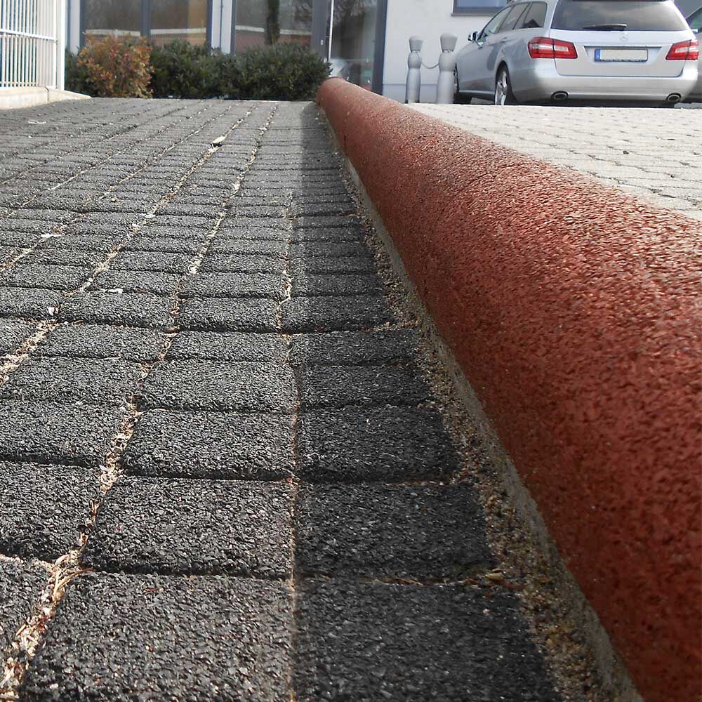 Betonové obrubníky s povrchem z čistého pryžového granulátu nabízejí vysoce kvalitní designovou alternativu ke konvenčním betonovým obrubníkům. Zároveň kombinují výhody obou systémů: zhutněné pryžové granule jsou protiskluzové. Díky svému konvenčnímu zpracování jsou obzvláště oblíbené u zahradníků a krajinářů. Instalace na porézní podklady probíhá na betonovém základu.