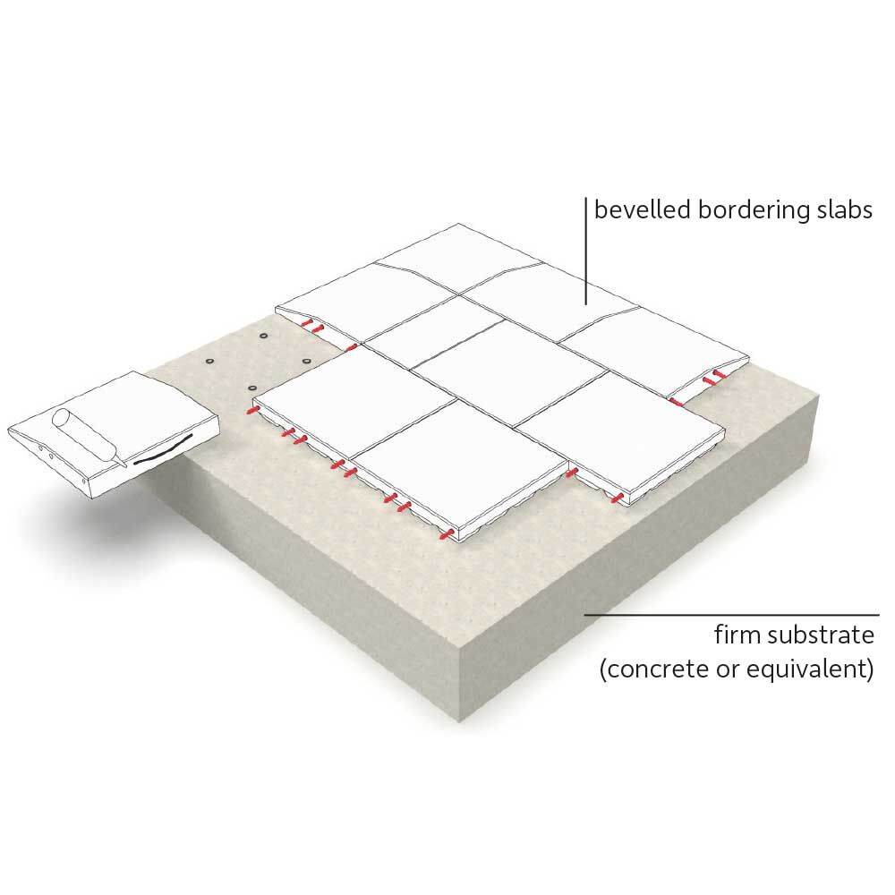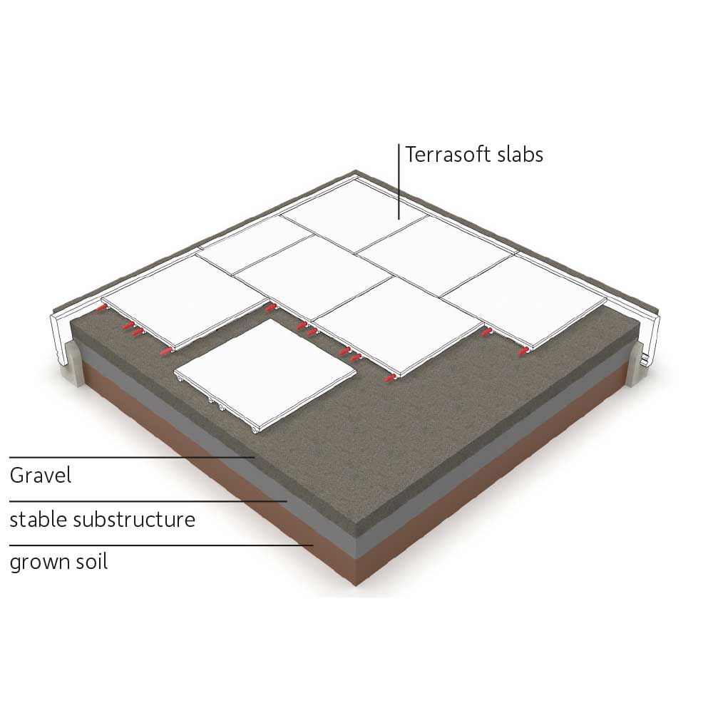 Dlaždice o tloušťce 6,5 cm z čistého pryžového granulátu, spojeného a povrchově upraveného polyuretanem. Tato dlaždice se pokládá na stávající pevné podklady, čímž vytváří izolované kotvení podlahy. Stávající betonové povrchy lze pomocí Terrasoft Slab 45 rychle a snadno renovovat. Dlaždice navíc tlumí zvuk, což je obzvlášť důležité na terasách a balkonech, stejně jako její protiskluzové vlastnosti. Bezpečný pohyb po povrchu je doplněn ortopedickými výhodami v oblastech, kde je zapotřebí tlumení nárazů mimo jiné. Podlaha tlumí nárazy (výška pádu 2 m).