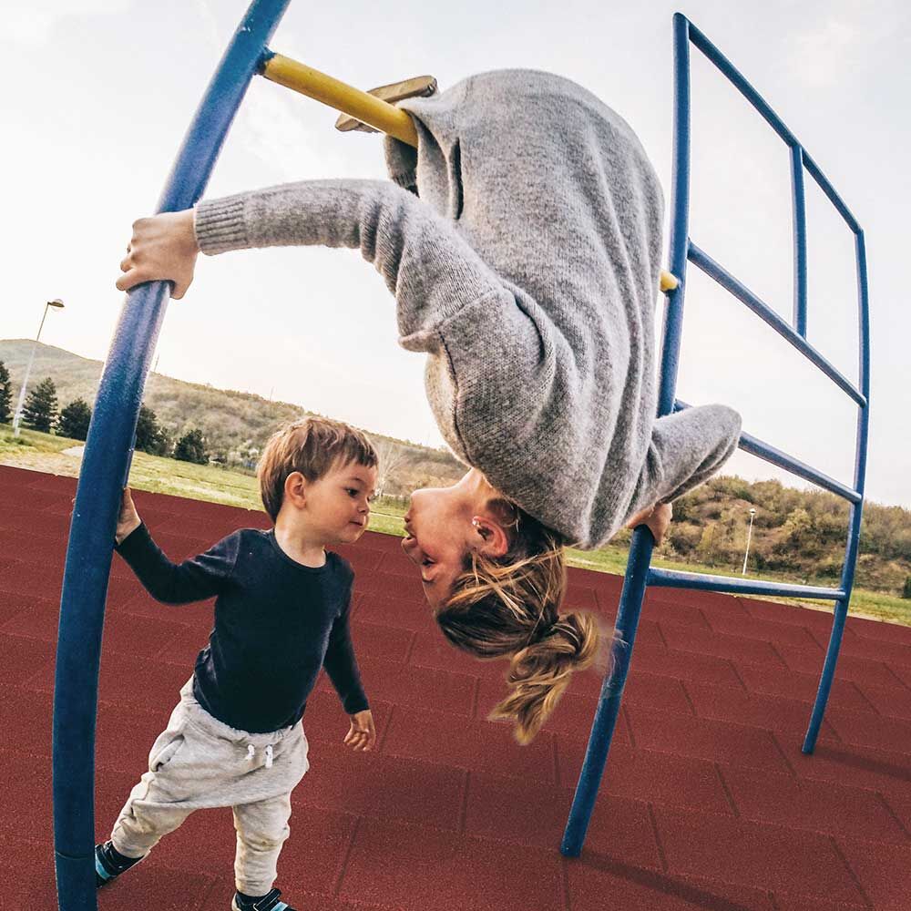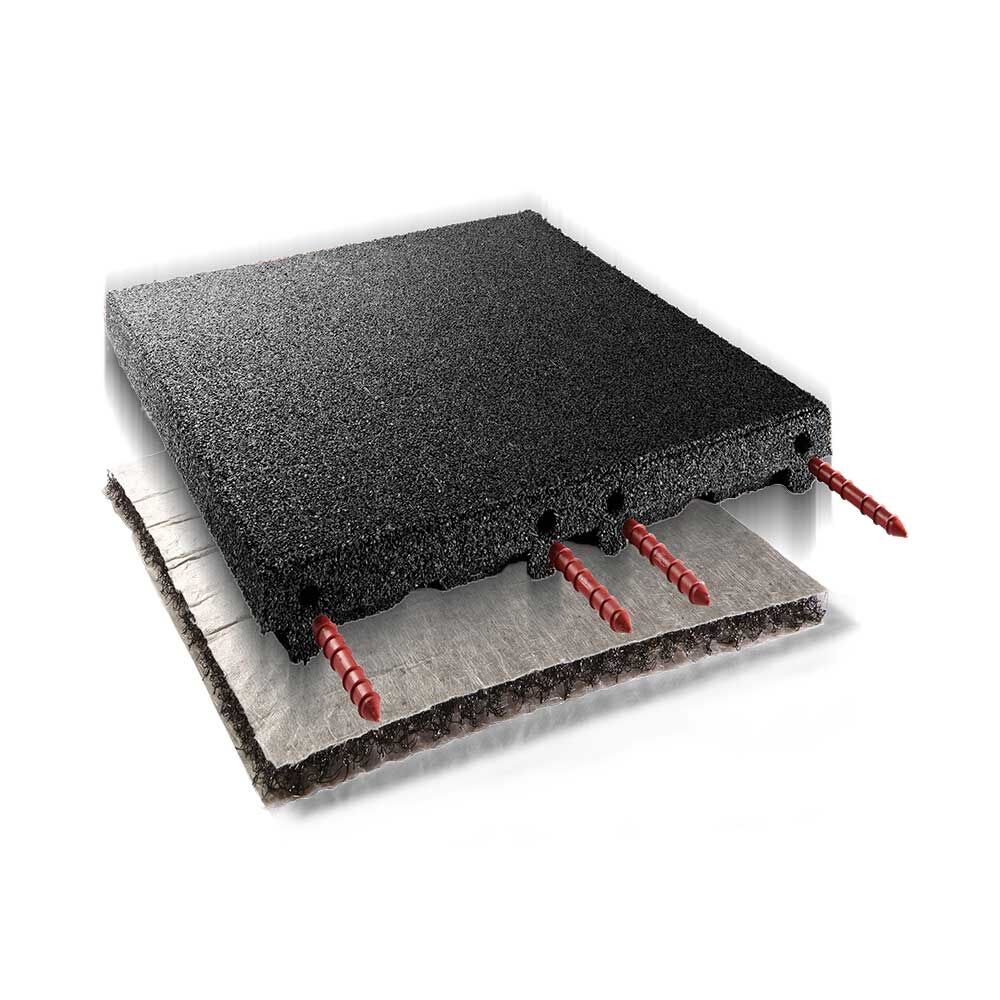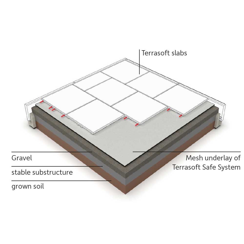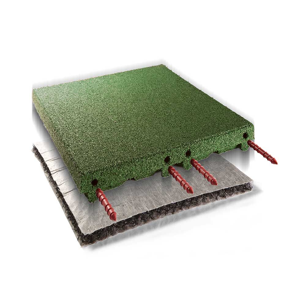 Dopadová plocha o tloušťce 6,5 cm vyrobená z čistého pryžového granulátu a plastové síťoviny.