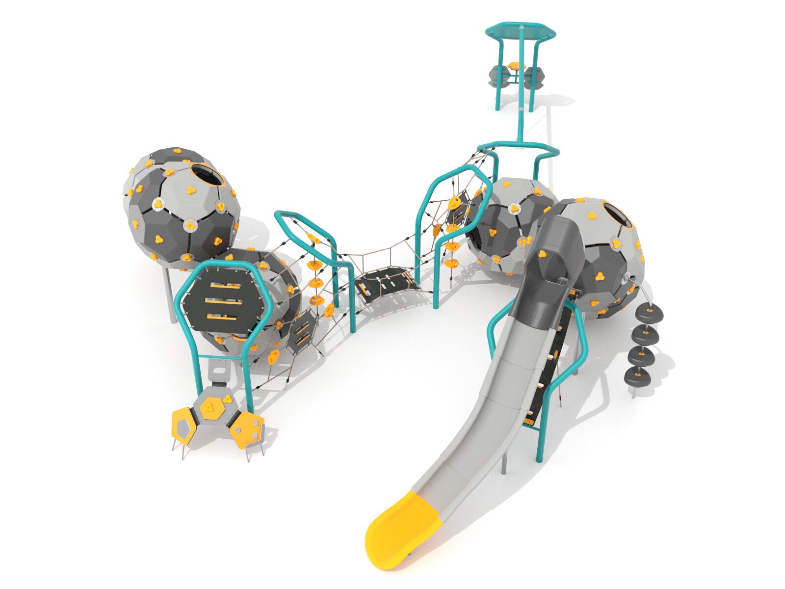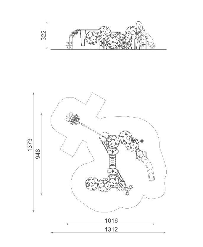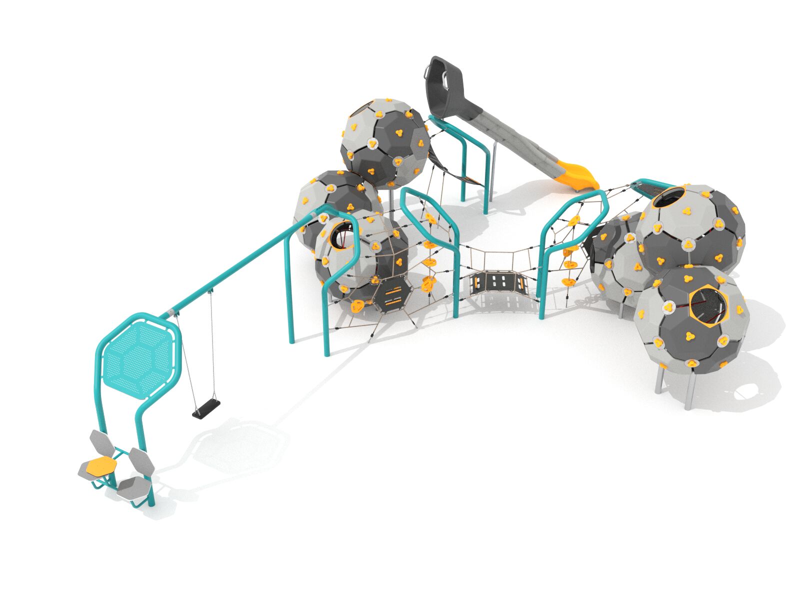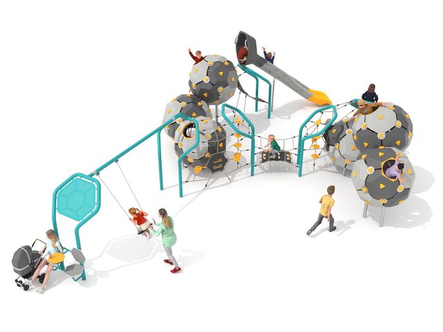 6x lezecká koule Bubbles, 6x rám ve tvaru šestiúhelníku, 1x skluzavka, 1x řetězová houpačka se sedátkem klasik, lanové sítě, 1x modul s výkyvnou lezeckou stěnou, 2x vertikální lano s nášlapy, 1x lanový most, 1x odpočinková zóna s posezením
