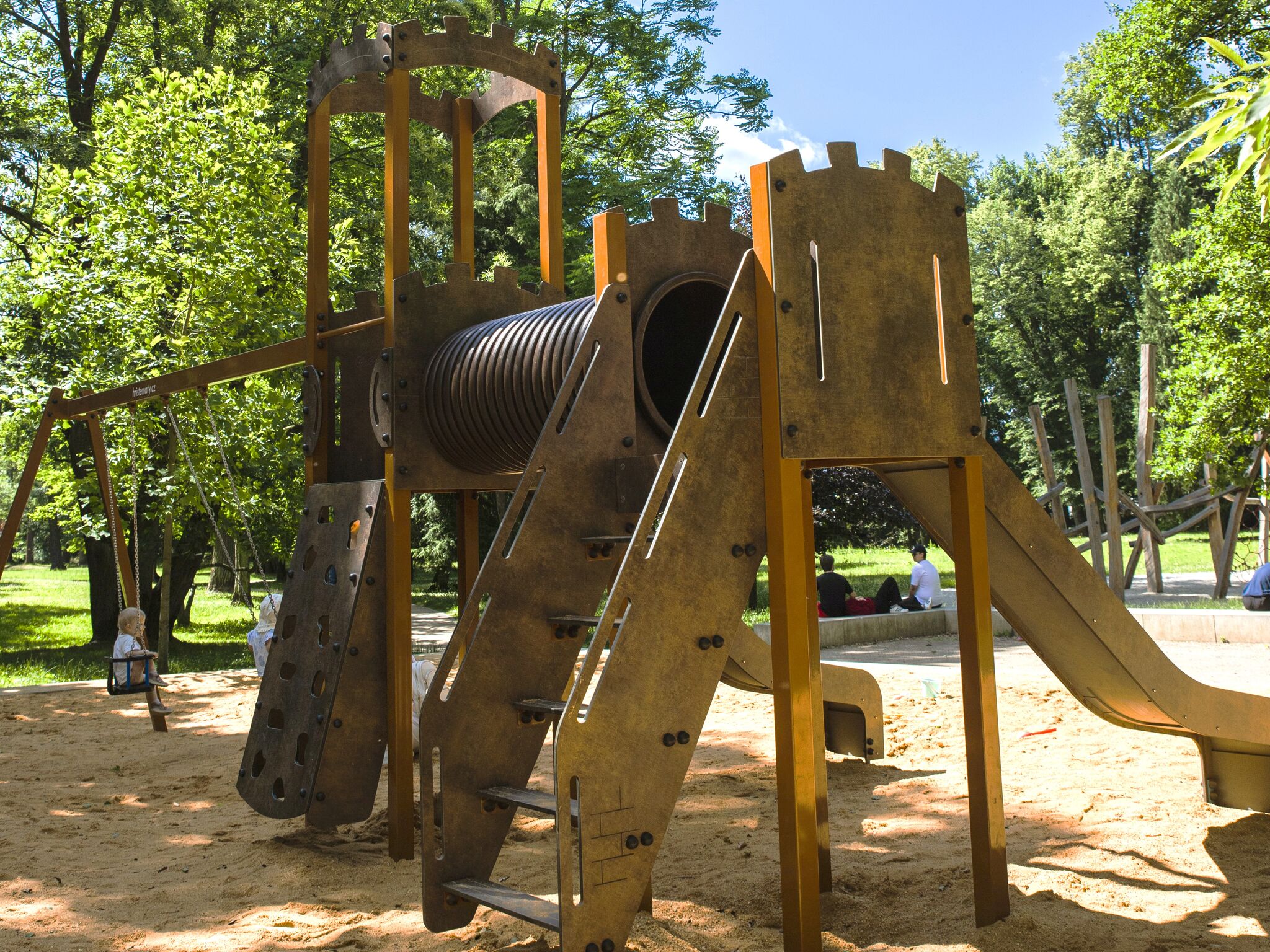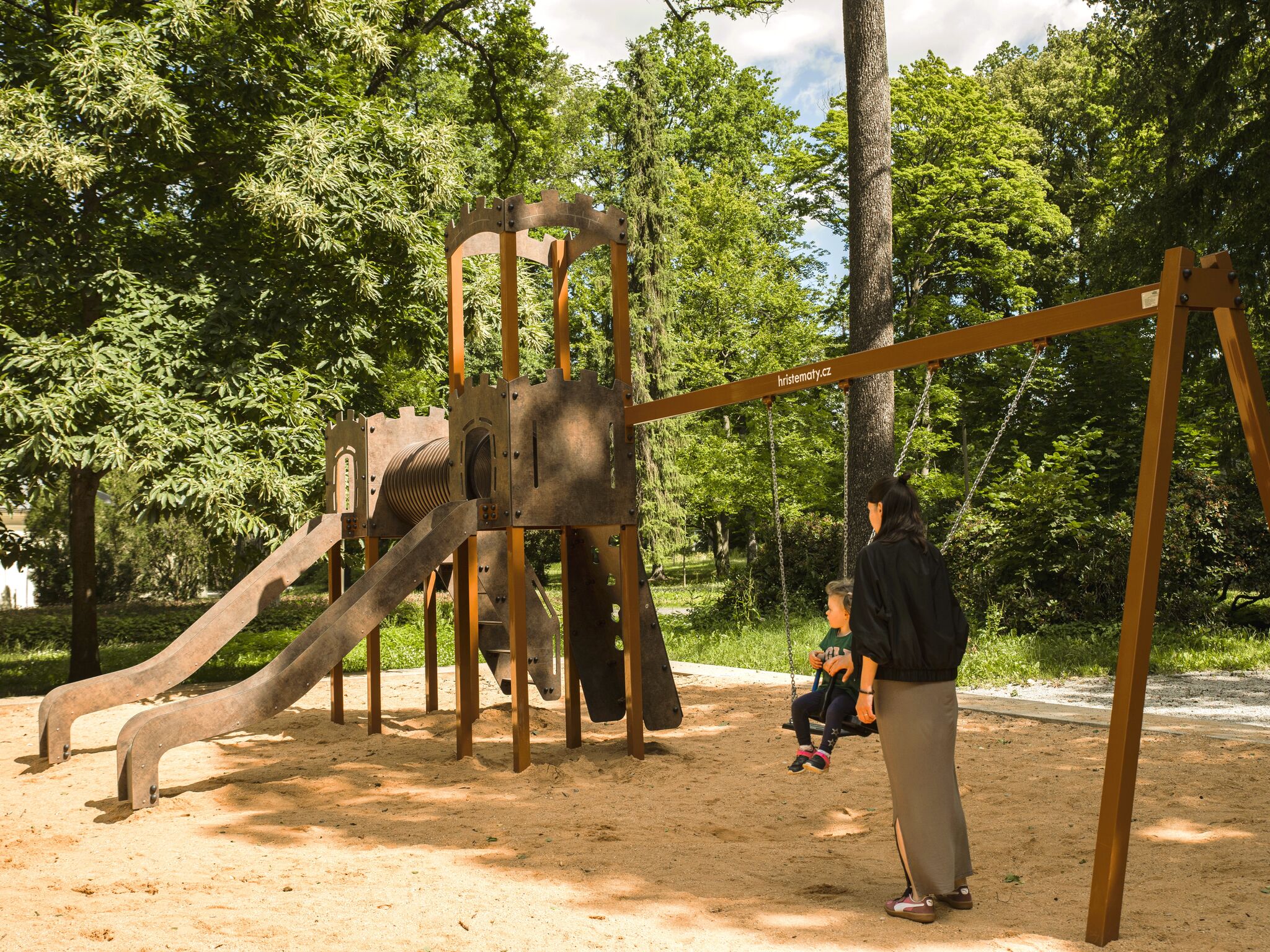 2x věž, 1x cimbuří, 2x skluzavka, 1x tunel, 1x schody, 1x lezecká stěna, 1x rameno, 2x řetězová houpačka, 1x sedátko normal, 1x sedátko baby
