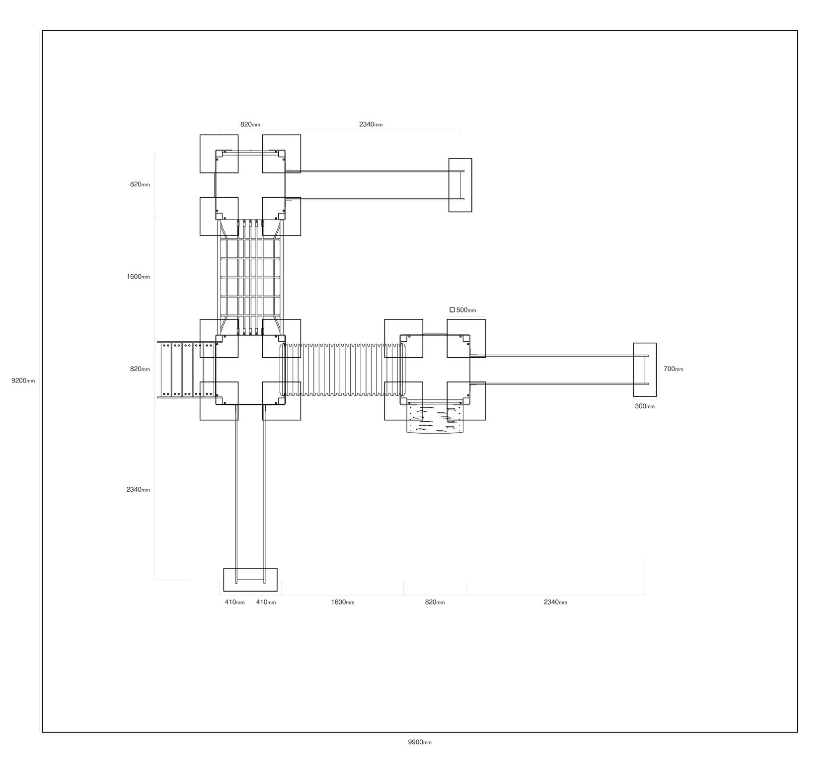 3x věž, 1x cimbuří, 3x skluzavka, 1x tunel, 1x lanový most, 1x schody, 1x lanový výlez, 1x lezecká stěna, bočnice