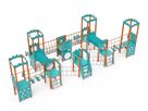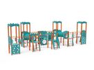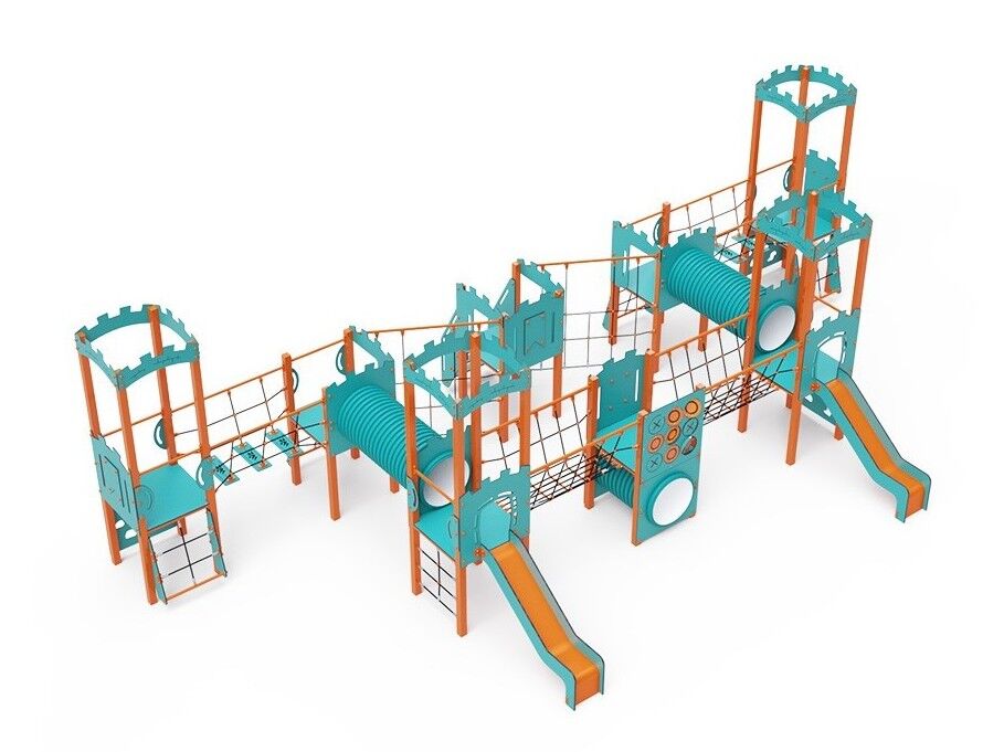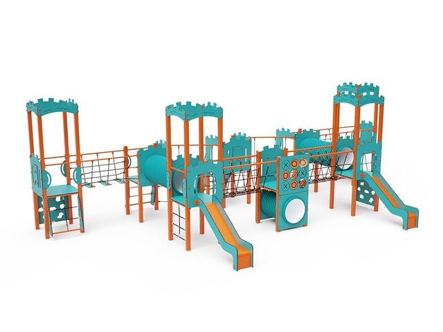 Osmivěžová kombinovaná sestava. Čtyři věže se stěnami a čtyři nízké věže jsou propojeny lanovými mosty, lanovými vyrovnávacími mosty, tunely a diagonálními lanovými stěnami. Sestava obsahuje schůdky, kolmou lezeckou stěnu, diagonální lanovou síť, tunely a dvě skluzavky. Tyrkysovo oranžový design láká ke hře už z dálky. Ocelová konstrukce je odolná vůči povětrnostním vlivům díky zinkování a nátěru práškovou barvou. Použitý materiál HPL 6, 10, 15, 19 je chemicky odolný, odolný vůči UV záření - stálobarevný, netoxický, recyklovatelný a nerozbitný. Nehrozí, že by se děti poranily o ostré hrany nebo střepy. Lana jsou vyrobena z polyesterových vláken, která jsou omotána kolem centrální výztuhy. Tato konstrukce lana zvyšuje jeho pevnost a odolnost vůči mechanickému namáhání. Samotný polyester je odolný vůči mikroorganismům, povětrnostním vlivům, rychle schne po dešti, je stálobarevný a vyznačuje se vysokou pevností. Všechny spoje jsou z nerezové oceli a pro zvýšení odolnosti a bezpečnosti jsou kryty plastovými krytkami.