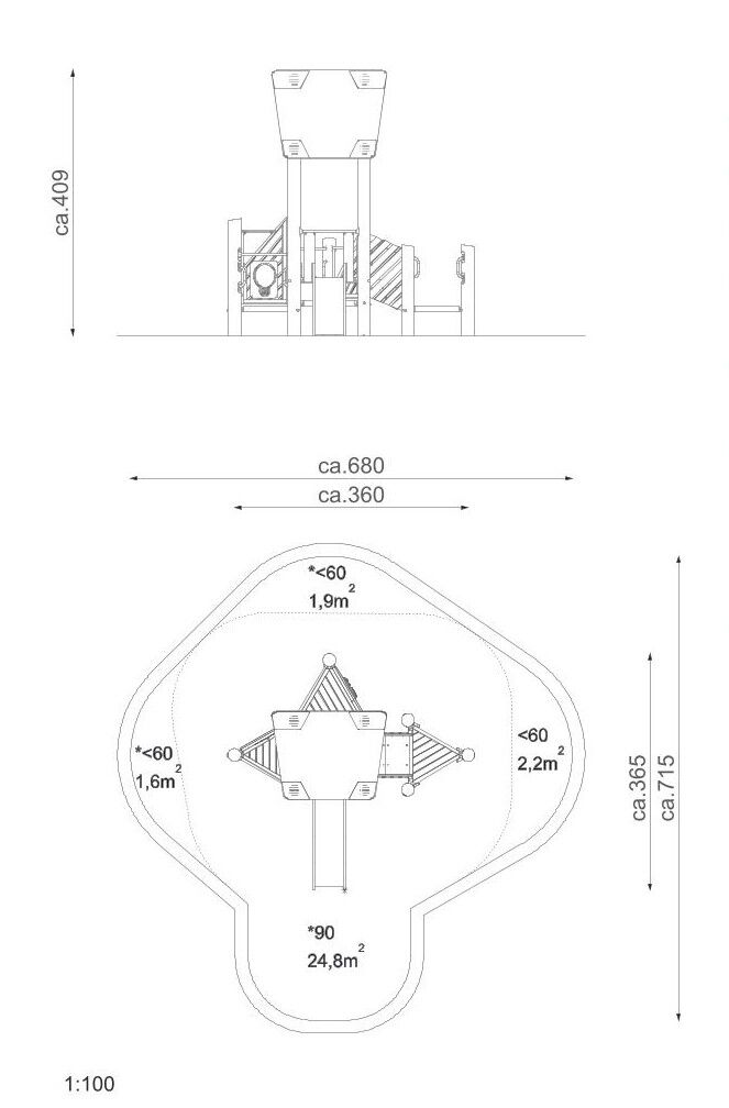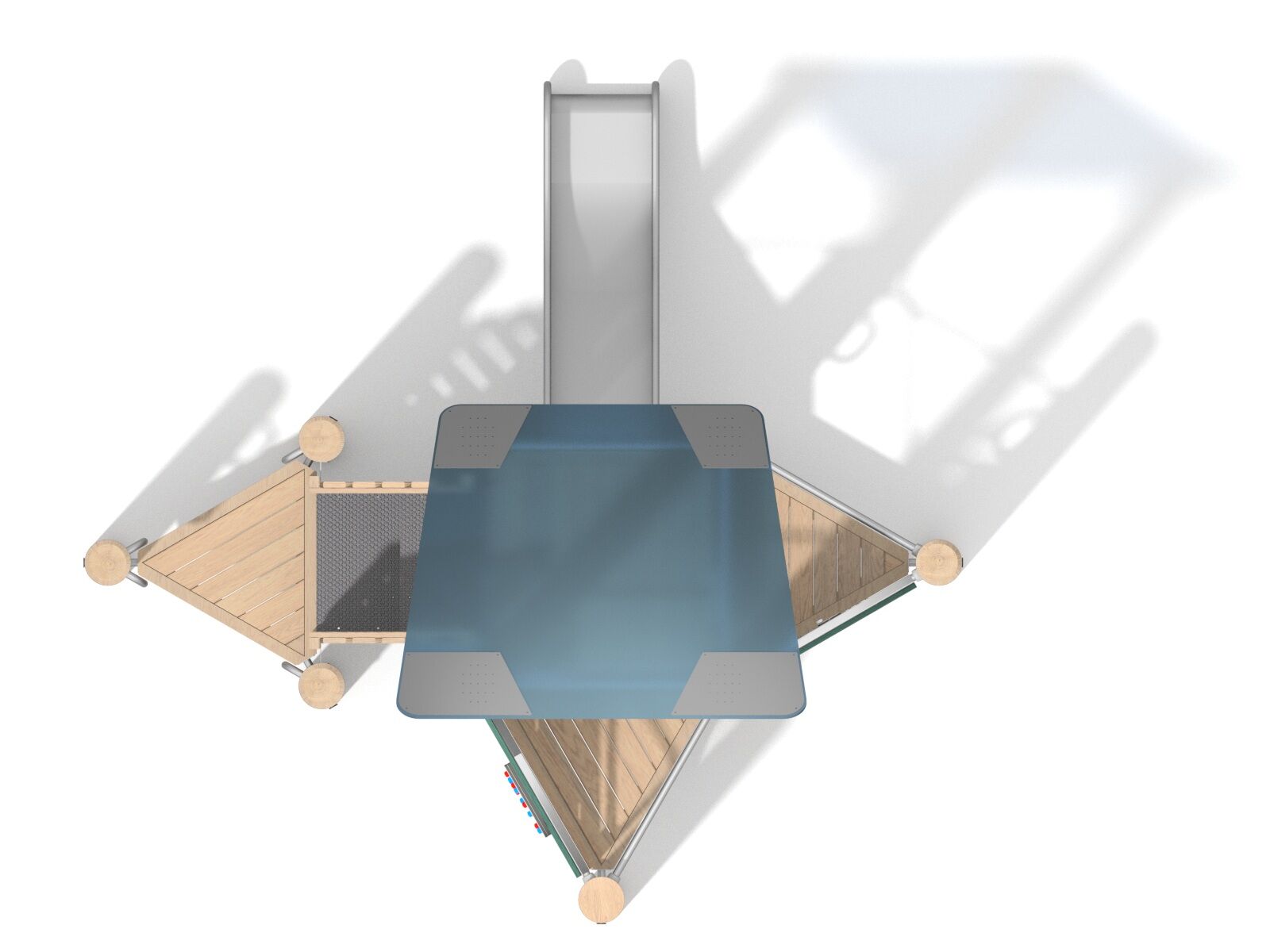 9x sloupek, 1x čtvercová věž, 3x trojúhelníková plošina, 1x barevná polykarbonátová střecha, 1x schodiště se zábradlími, 1x skluzavka, edukační prvky
