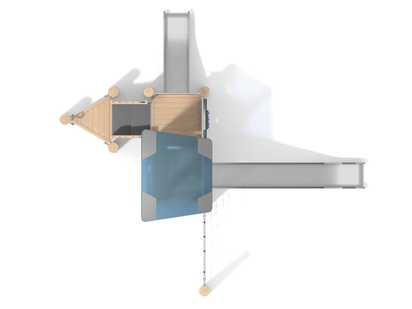Dvojvěžová akátová sestava. Herní sestava obsahuje dvě skluzavky, schody, lanovou síť, lezeckou stěnu a edukační prvky.
