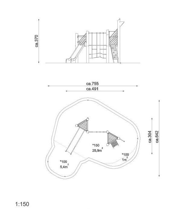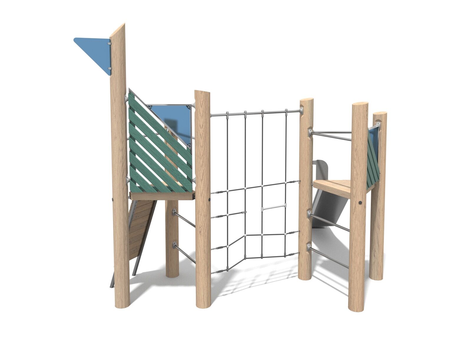 Dvojvěžová akátová sestava. Herní sestava obsahuje skluzavku, lanovou síť, lezeckou stěnu a žebříkové výlezy.