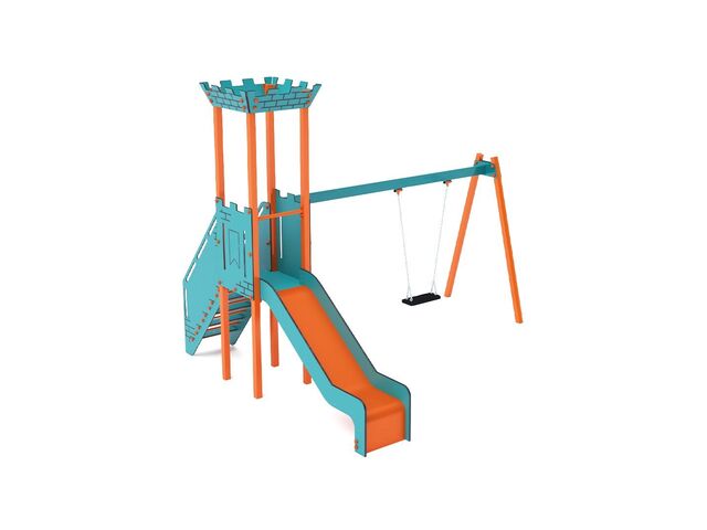 Jednověžová kombinovaná sestava s cimbuřím na kterou mohou děti vylézt po schodech a dolů se mohou sklouznout po skluzavce. Sestava je doplněna řetězovou houpačkou se sedátkem normal. Tyrkysovo-oranžový design láká ke hře už z dálky. Ocelová konstrukce je díky zinkování a kvalitnímu práškovému nátěru odolná vůči povětrnostním vlivům. Použitý materiál HPL je chemicky odolný, odolný vůči UV záření - stálobarevný, netoxický, recyklovatelný a nerozbitný. Nehrozí, že by se děti poranily o ostré hrany nebo střepy. Všechny spoje jsou z nerezové oceli a pro zvýšení odolnosti a bezpečnosti jsou kryty plastovými krytkami.