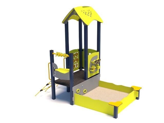 1x střecha, 1x pískoviště, 1x lanový výlez, 1x piškvorky, 1x počítadlo, 1x pultík, 1x panel s pískovým mlýnem, bočnice