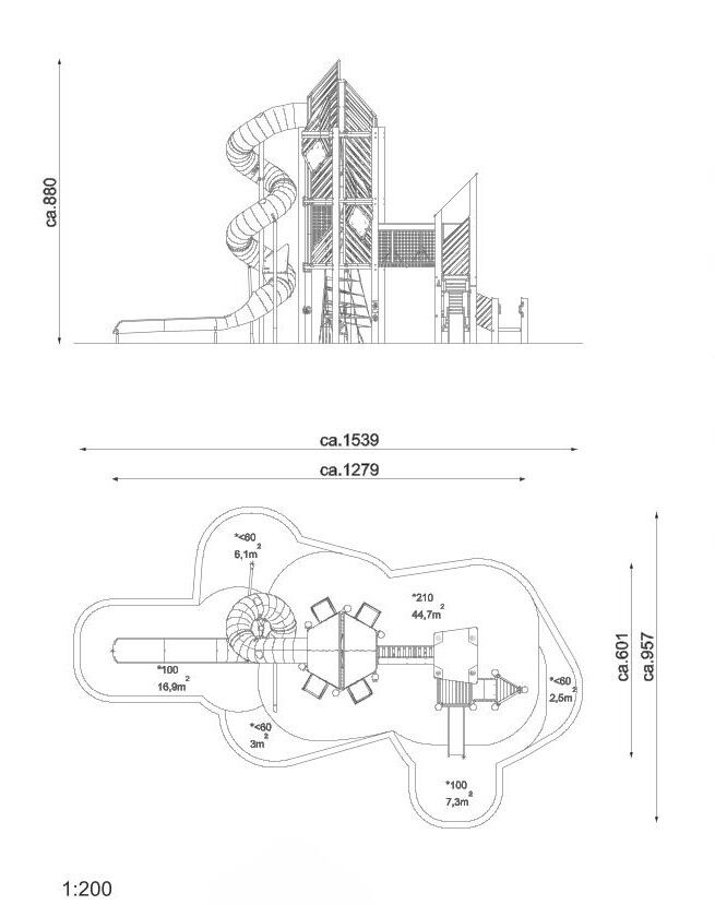 1x šestistranná věž, 1x malá čtvercová věž, 1x přídavná trojúhelníková plošina, 1x trojrozměrná lezecká síť, 1x střecha pro velkou věž, 1x střecha pro malou věž, 1x tobogán, 4 x diamantové průchody mezi úrovněmi věží, 1x skluzavka, 1x lezecká stěna, 1x uzavřený most, 1x schodišťový průchod s madly, 3x vysoké stěny
