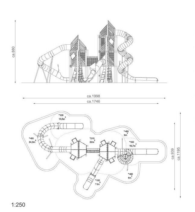 2x šestistranná věž, 2x trojrozměrná lanová síť, 1x střecha pro malou věž, 1x střecha pro velkou věž, 3x tobogán, 5x diamantový průchod mezi úrovněmi věží, 1x uzavřený most