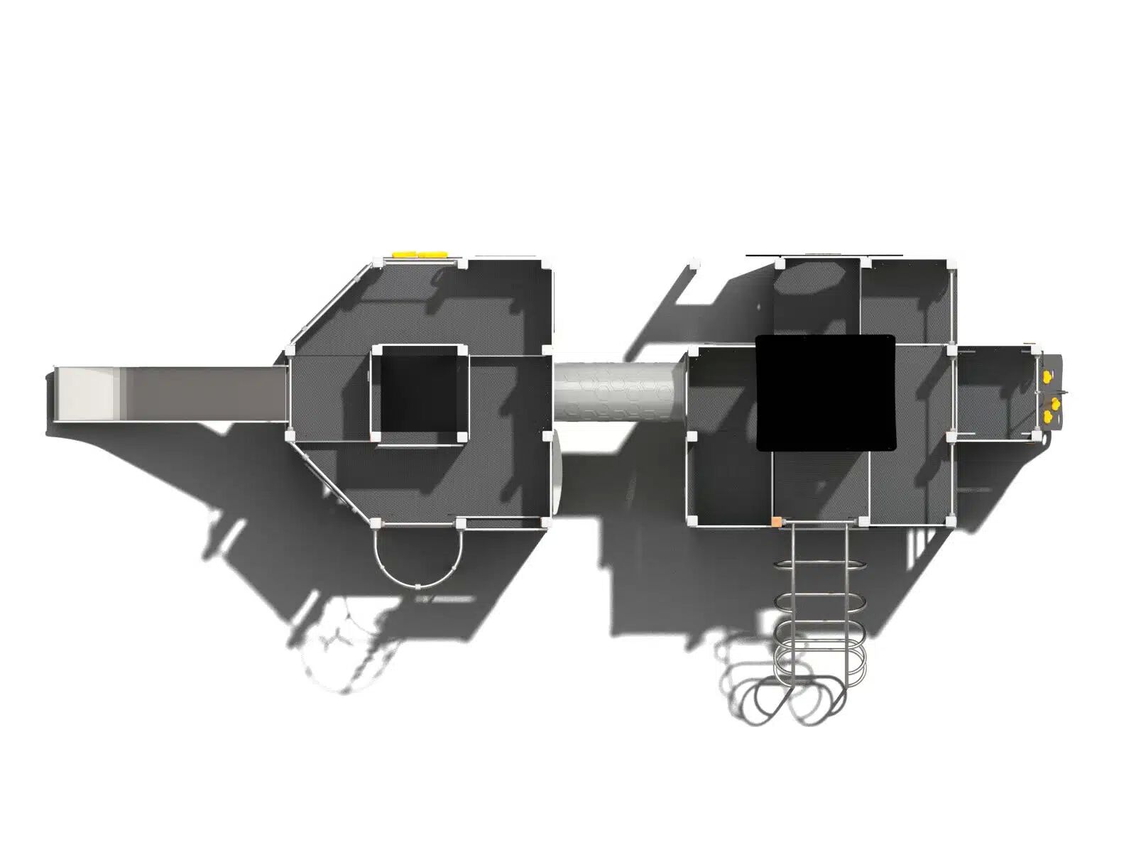 1x skluzavka, 2x lezecká stěna, 1x lezecká stěna s lanem, 1x tunel, 1x šikmý žebřík, 1x lanový výlez, 2x žebříkový výlez, edukační prvky, bočnice