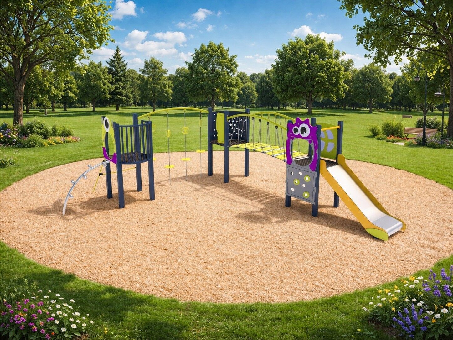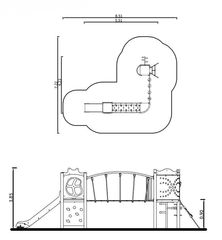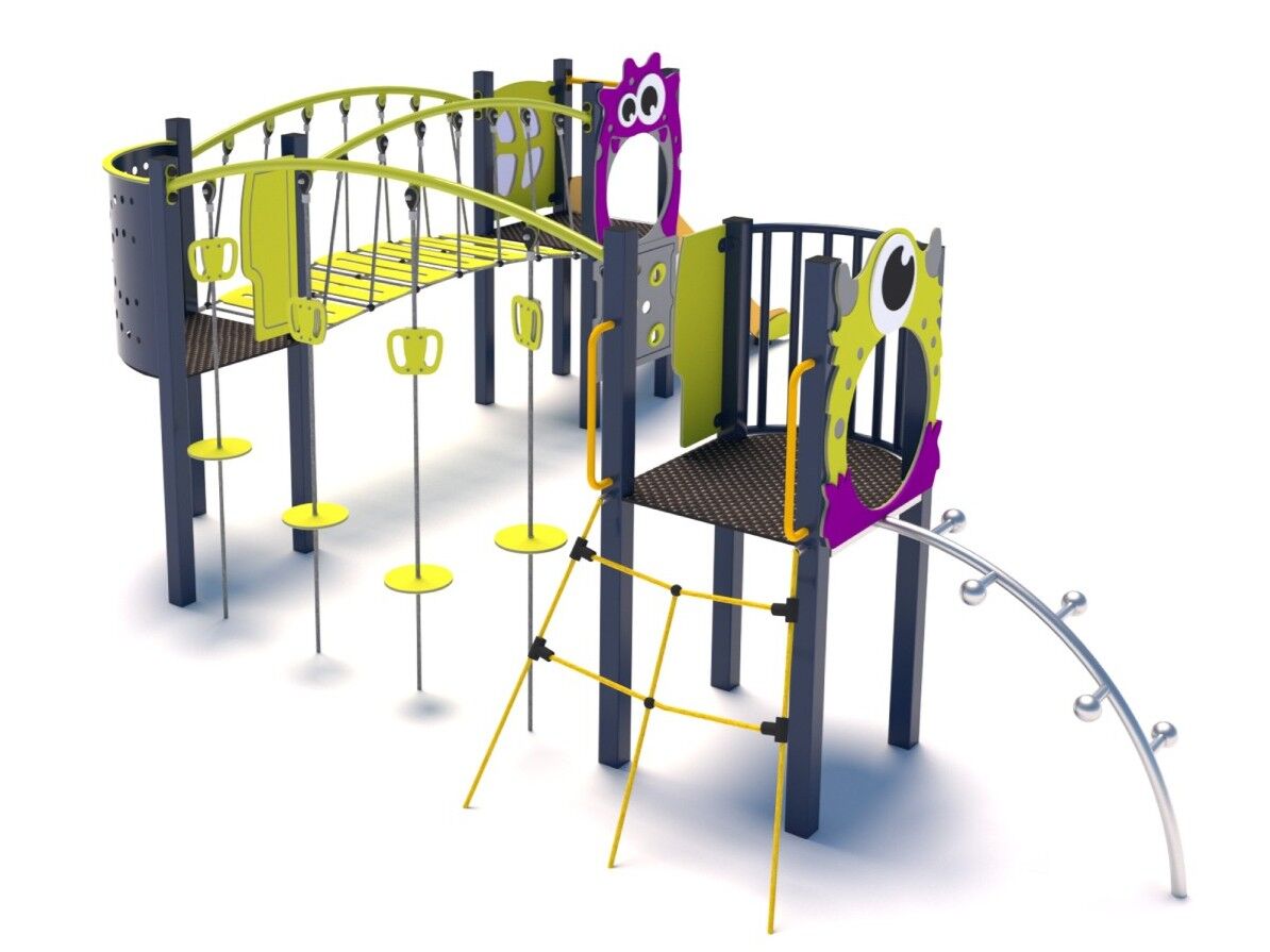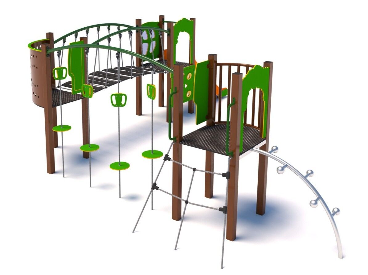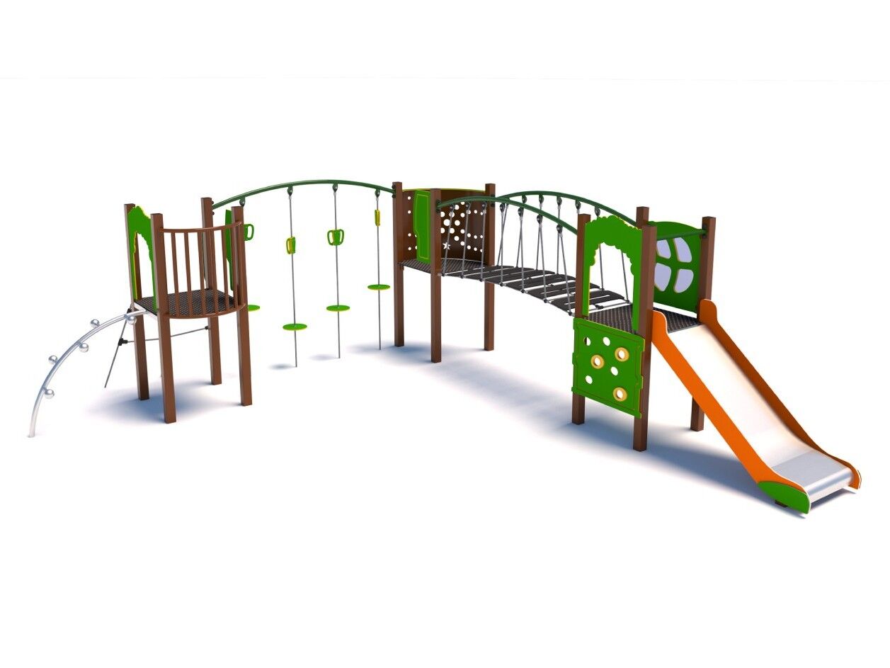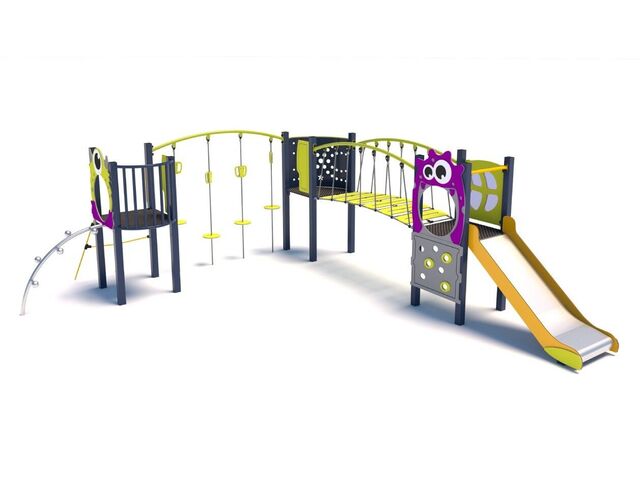 1x věž, 1x lezecká stěna, 1x obloukový žebřík, 1x lanový výlez, 4x lano s nášlapy a úchyty, 1x lanový most, 1x skluzavka, bočnice, ocelové konstrukce