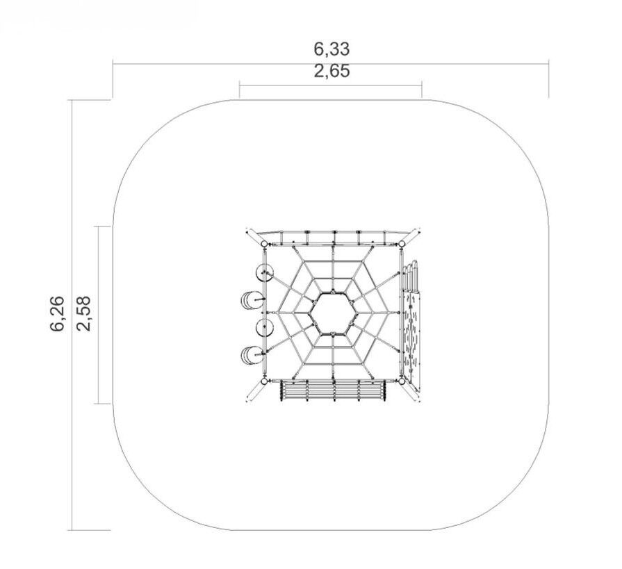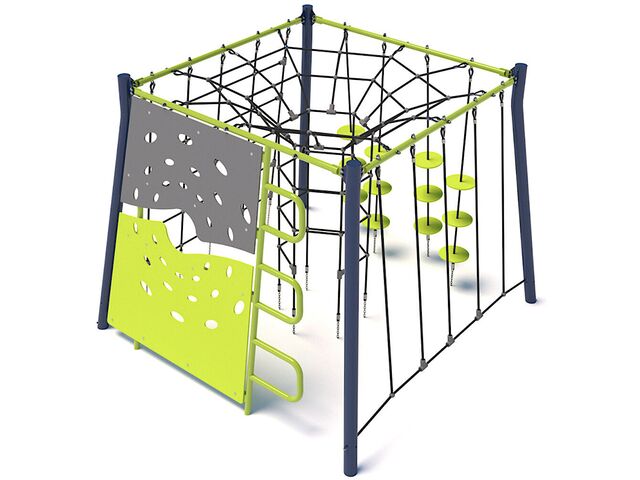 Lezecká sestava je tvořena pevnou konstrukcí z ocelových trubek o průměru 88,9 mm, které jsou pozinkované a opatřené práškovou barvou pro vysokou odolnost vůči korozi i povětrnostním vlivům. Lanové prvky jsou vyrobeny z polypropylenu s ocelovým jádrem, což zajišťuje jejich pevnost a dlouhou životnost. Spojovací prvky z nerezové oceli garantují bezpečnost a spolehlivost konstrukce, stěny z odolného HDPE materiálu vynikají vysokou odolností vůči povětrnostním vlivům a dlouhou životností bez nutnosti náročné údržby. Sestava je díky použitým materiálům vhodná pro dlouhodobé venkovní využití s minimálními nároky na údržbu.