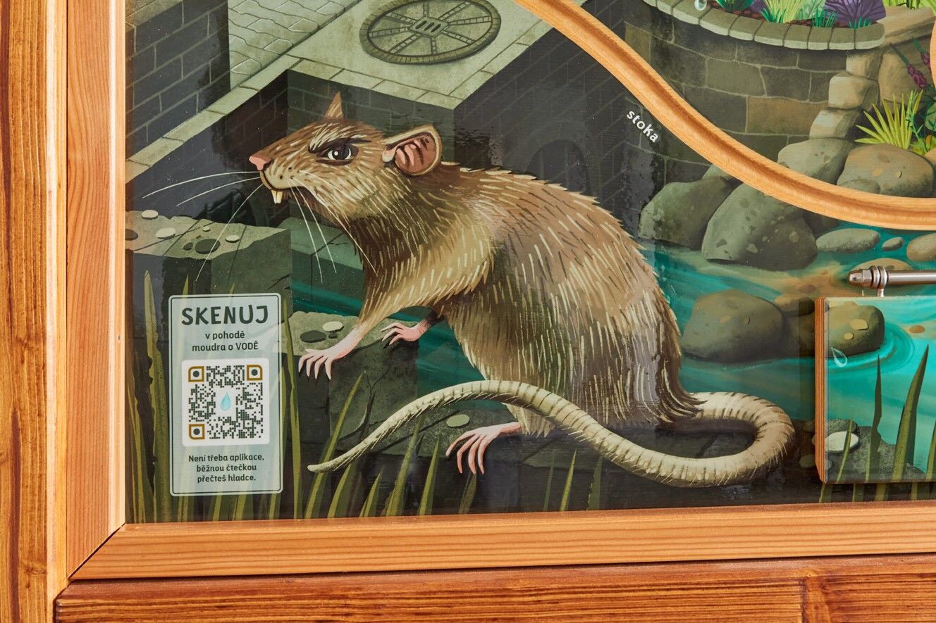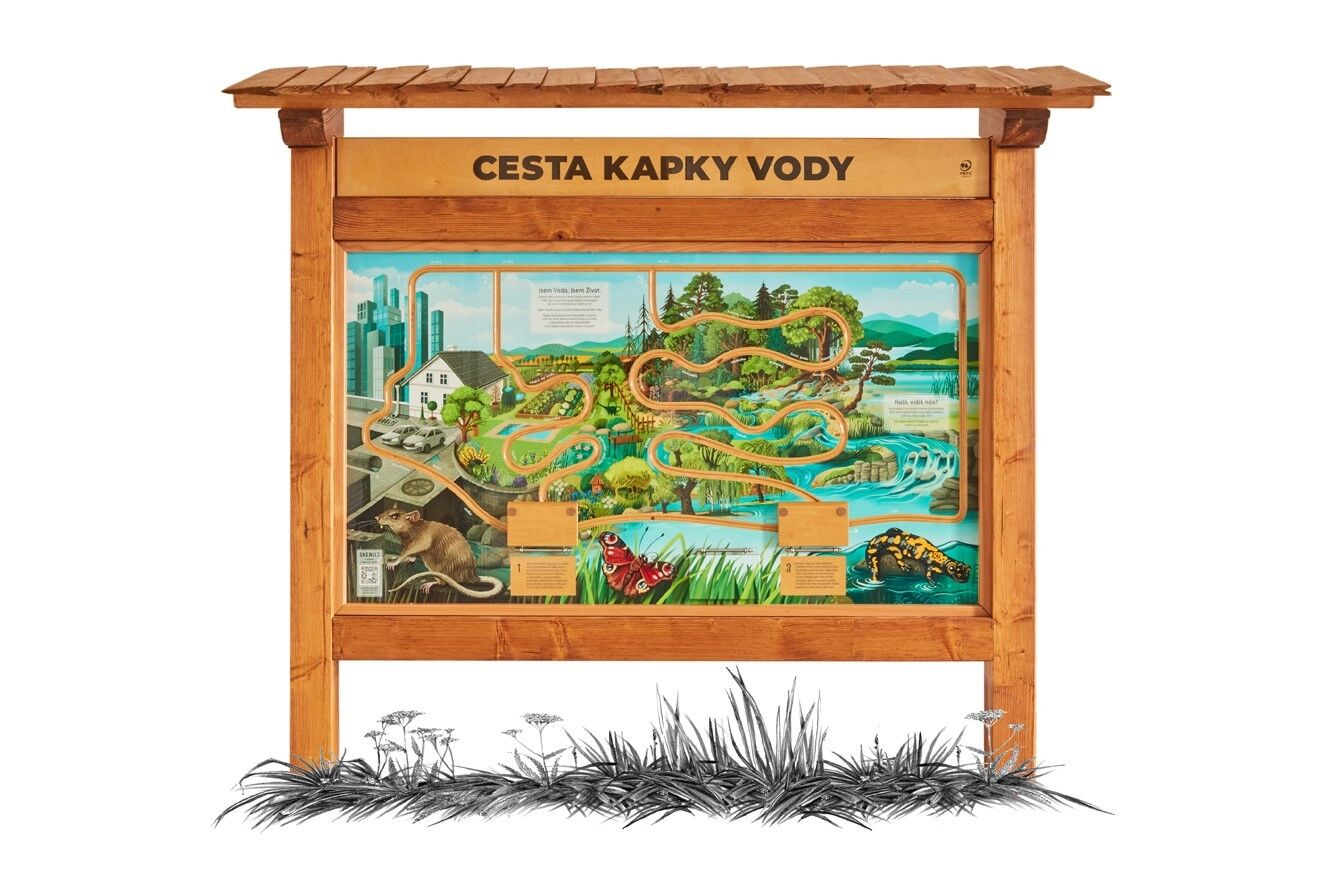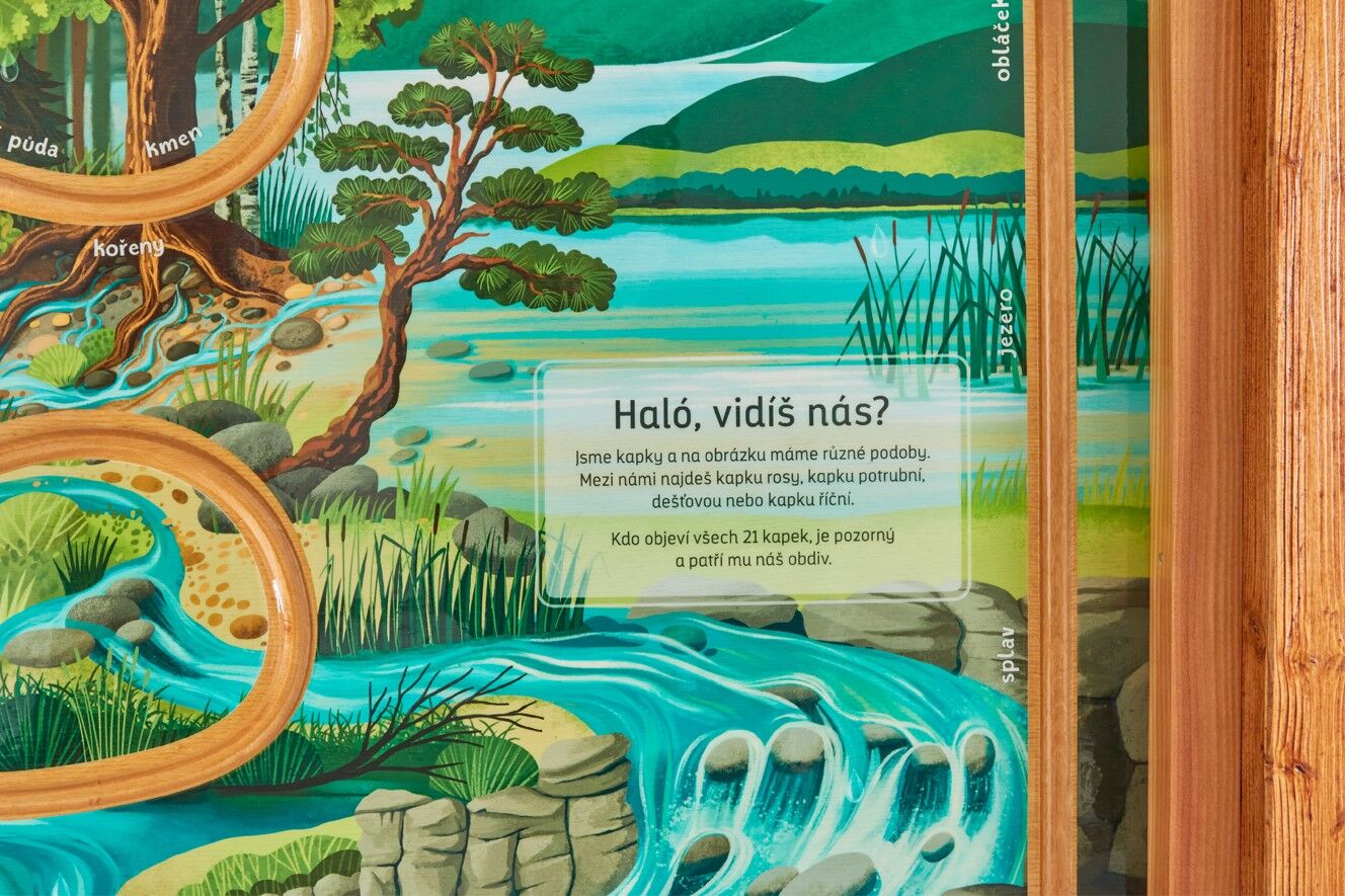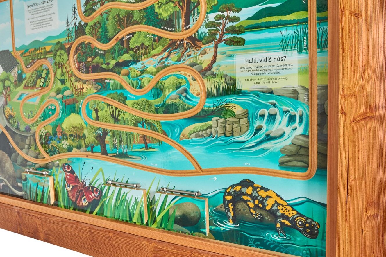 Naučný prvek vás seznámí s principem zadržování vody v krajině. Na prvku je QR kód, pod kterým najdete pracovní listy na téma vodní koloběh a můžete si je zdarma stáhnout. Prstem cestujte po labyrintu, který vás provede cestou kapky vody. "Haló, vidíš nás?" Na panelu hledejte různé podoby kapek (např. dešťovou, říční nebo potrubní). Kdo objeví všech 21 kapek, patří mu náš obdiv. Rozměry konstrukce jsou přizpůsobené dětem předškolního věku a dětem ZŠ 1. stupně. Součástí prvku je kotvící materiál k zabetonování (ocelová kotva L, spojovací materiál, počet dle potřeb stojanu). Vyrobeno z masivního smrkového KVH hranolu a voděodolné překližky. Střecha je šindelová. Barvu nátěru konstrukce prvku si můžete zvolit dle vzorníku který na přání zasíláme v elektronické podobě. Autorem kreseb jsou čeští ilustrátoři, obrázky jsou chráněny autorskými právy. Prvky jsou vyrobeny z ekologicky certifikovaného dřeva PEFC.