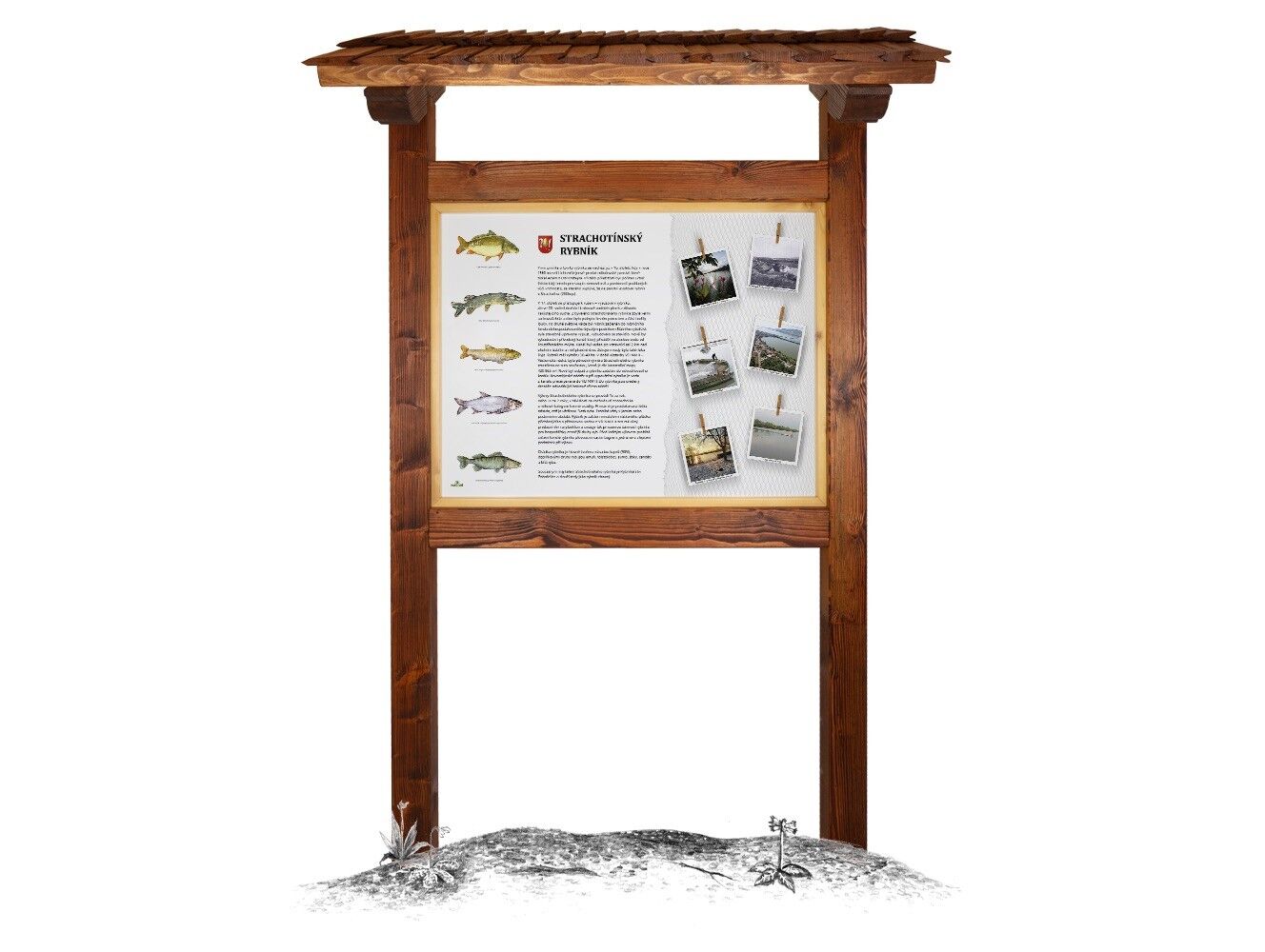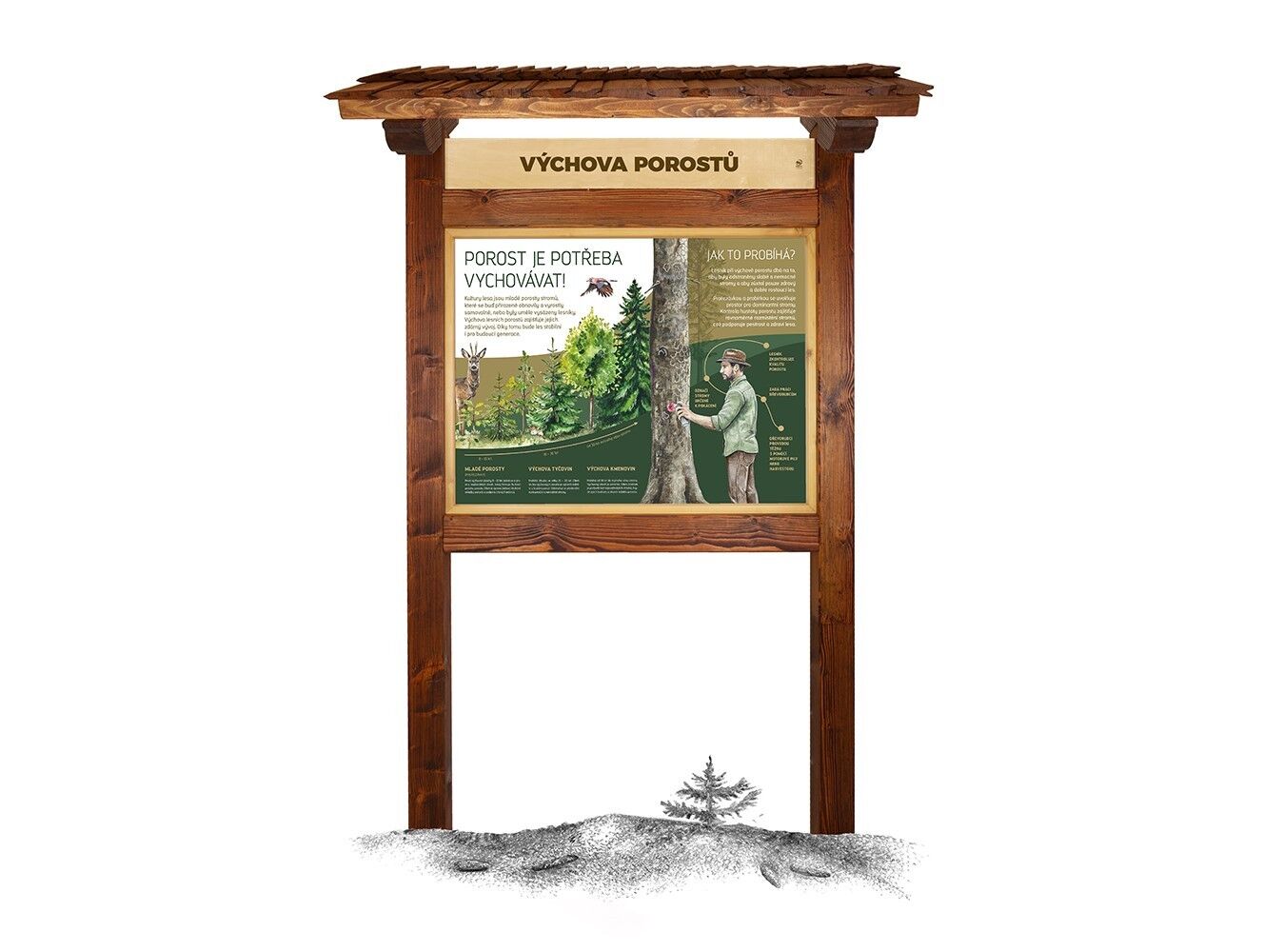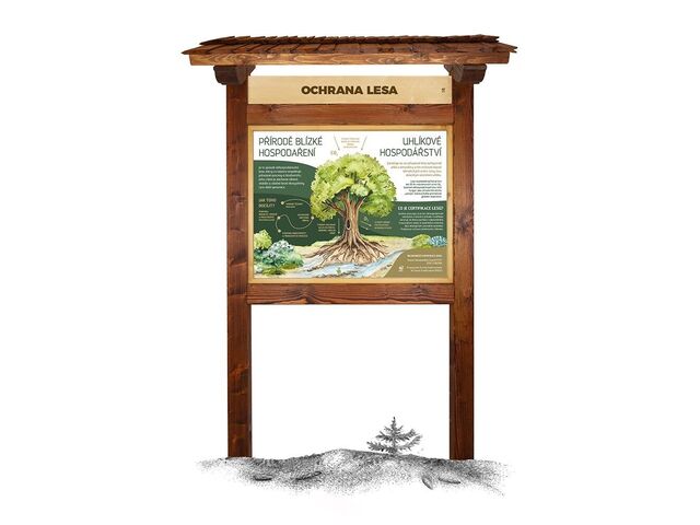 Součástí prvku je kotvící materiál k zabetonování (ocelová kotva L, spojovací materiál, počet dle potřeb stojanu). Vyrobeno z masivního smrkového KVH hranolu a dibondu. Střecha je šindelová. Barvu nátěru konstrukce prvku si můžete zvolit dle vzorníku který na přání zasíláme v elektronické podobě. Autorem kreseb jsou čeští ilustrátoři, obrázky jsou chráněny autorskými právy. Prvky jsou vyrobeny z ekologicky certifikovaného dřeva PEFC.