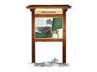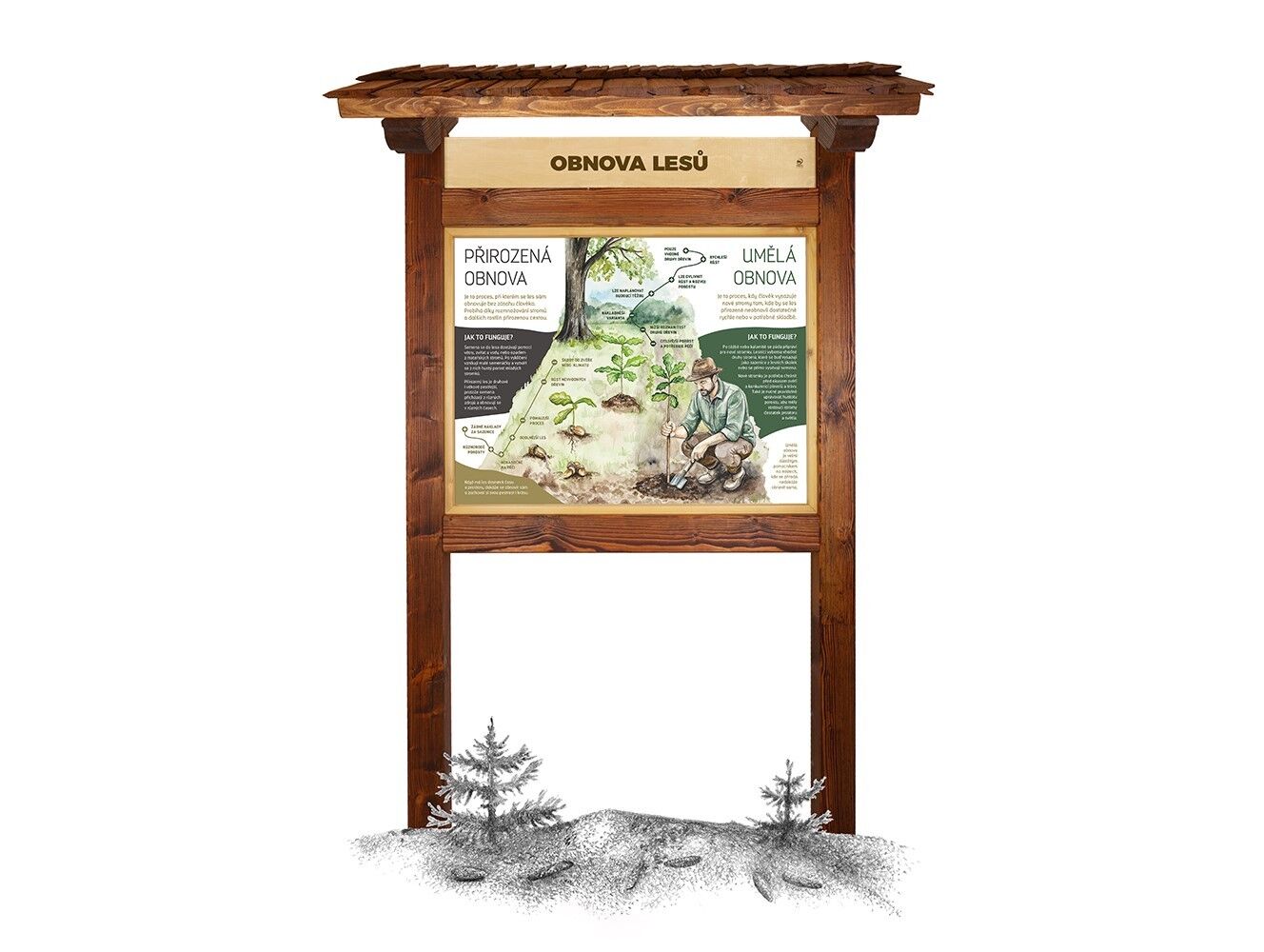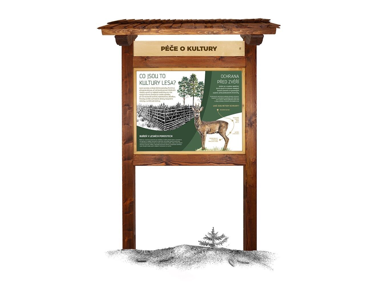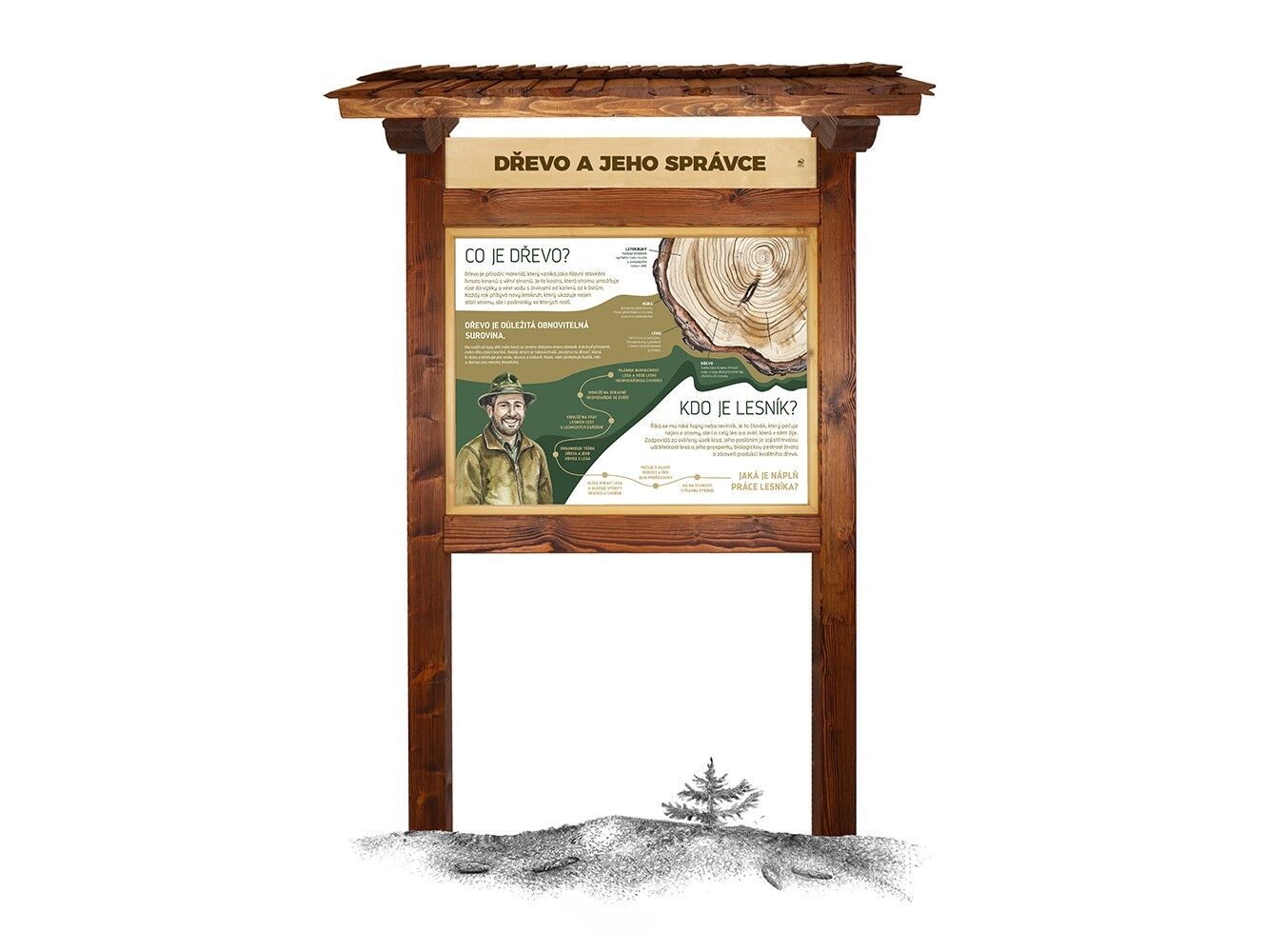 Součástí prvku je kotvící materiál k zabetonování (ocelová kotva L, spojovací materiál, počet dle potřeb stojanu). Vyrobeno z masivního smrkového KVH hranolu a dibondu. Střecha je šindelová. Barvu nátěru konstrukce prvku si můžete zvolit dle vzorníku který na přání zasíláme v elektronické podobě. Autorem kreseb jsou čeští ilustrátoři, obrázky jsou chráněny autorskými právy. Prvky jsou vyrobeny z ekologicky certifikovaného dřeva PEFC.