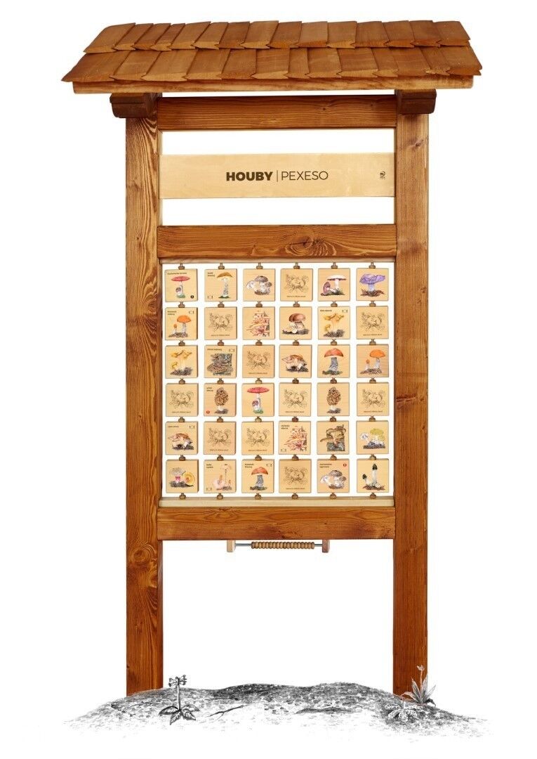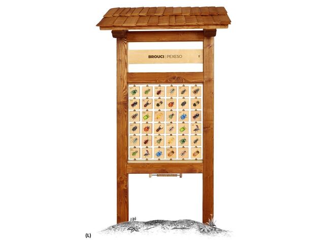 Na naučném prvku pexeso je 36 otočných tabulek o velikosti 10 × 10 cm. Na spodní části je umístěné počítadlo. Součástí prvku je kotvící materiál k zabetonování (ocelová kotva L, spojovací materiál, počet dle potřeb stojanu). Vyrobeno z masivního smrkového KVH hranolu, voděodolné překližky a javorového dřeva. Střecha je šindelová. Barvu nátěru konstrukce prvku si můžete zvolit dle vzorníku který na přání zasíláme v elektronické podobě. Autorem kreseb jsou čeští ilustrátoři, obrázky jsou chráněny autorskými právy. Prvky jsou vyrobeny z ekologicky certifikovaného dřeva PEFC.