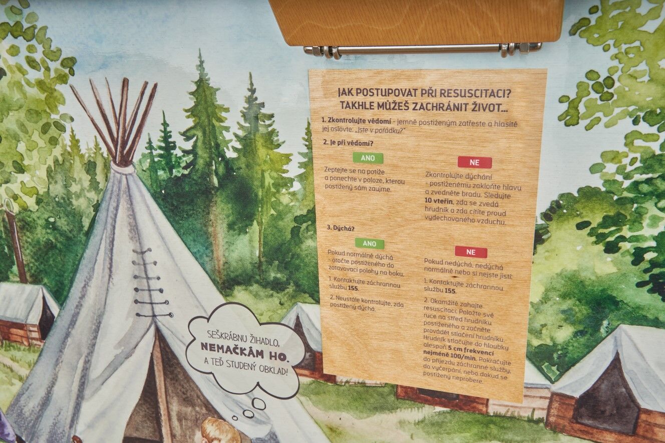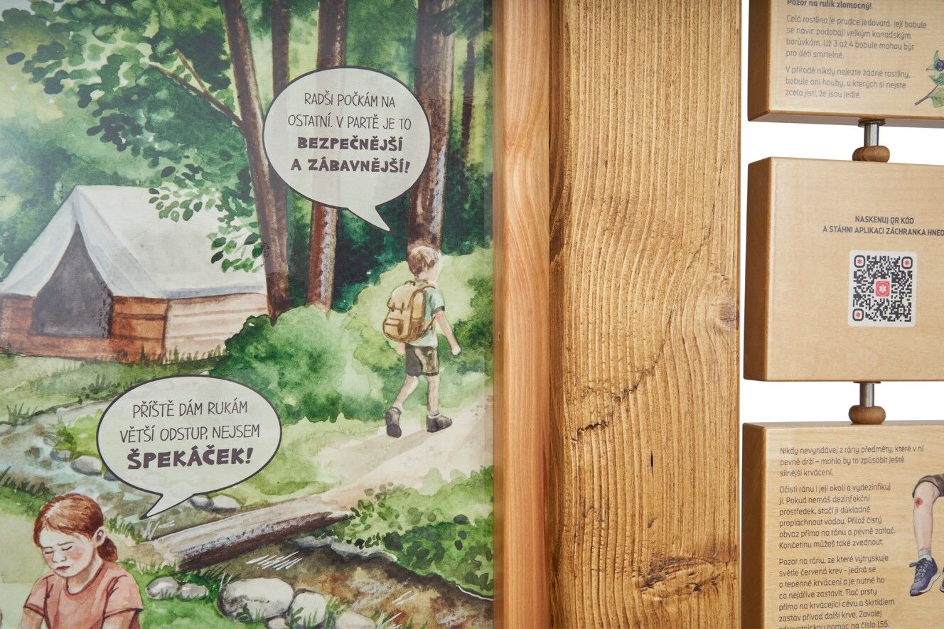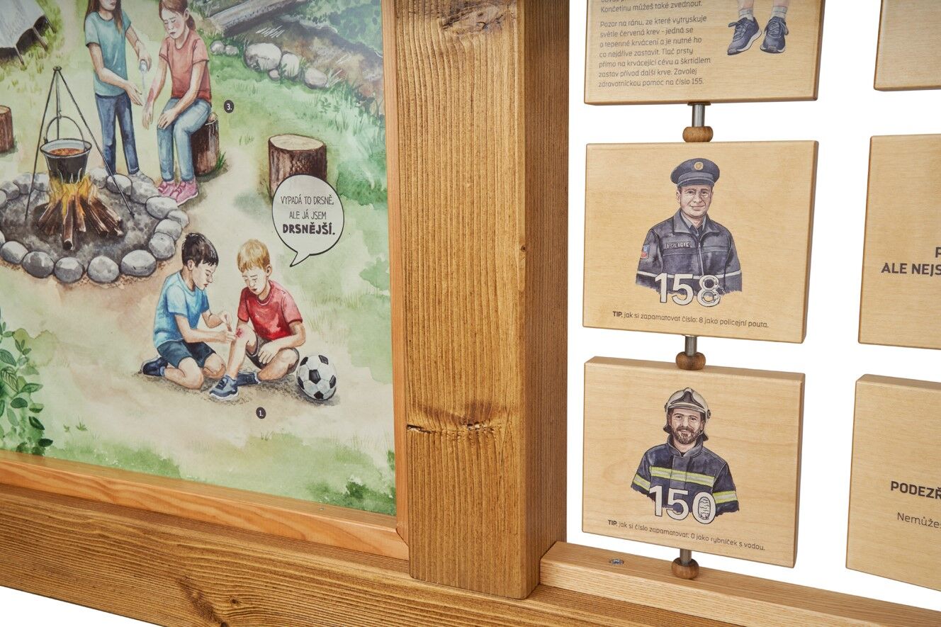 Prvek vás provede nejčastějšími úrazy při objevování přírody a poradí, jak se v takových situacích zachovat a na jaká čísla volat. Prvek vznikl ve spolupráci s aplikací ZÁCHRANKA. Na otočných tabulkách najdete důležitá telefonní čísla i různé typy zranění a jejich správné ošetření. 10 otočných tabulek má velikost 15 × 13 cm. Vyrobeno z masivního smrkového KVH hranolu, voděodolné překližky a javorového dřeva. Prvky jsou vyrobeny z ekologicky certifikovaného dřeva PEFC.