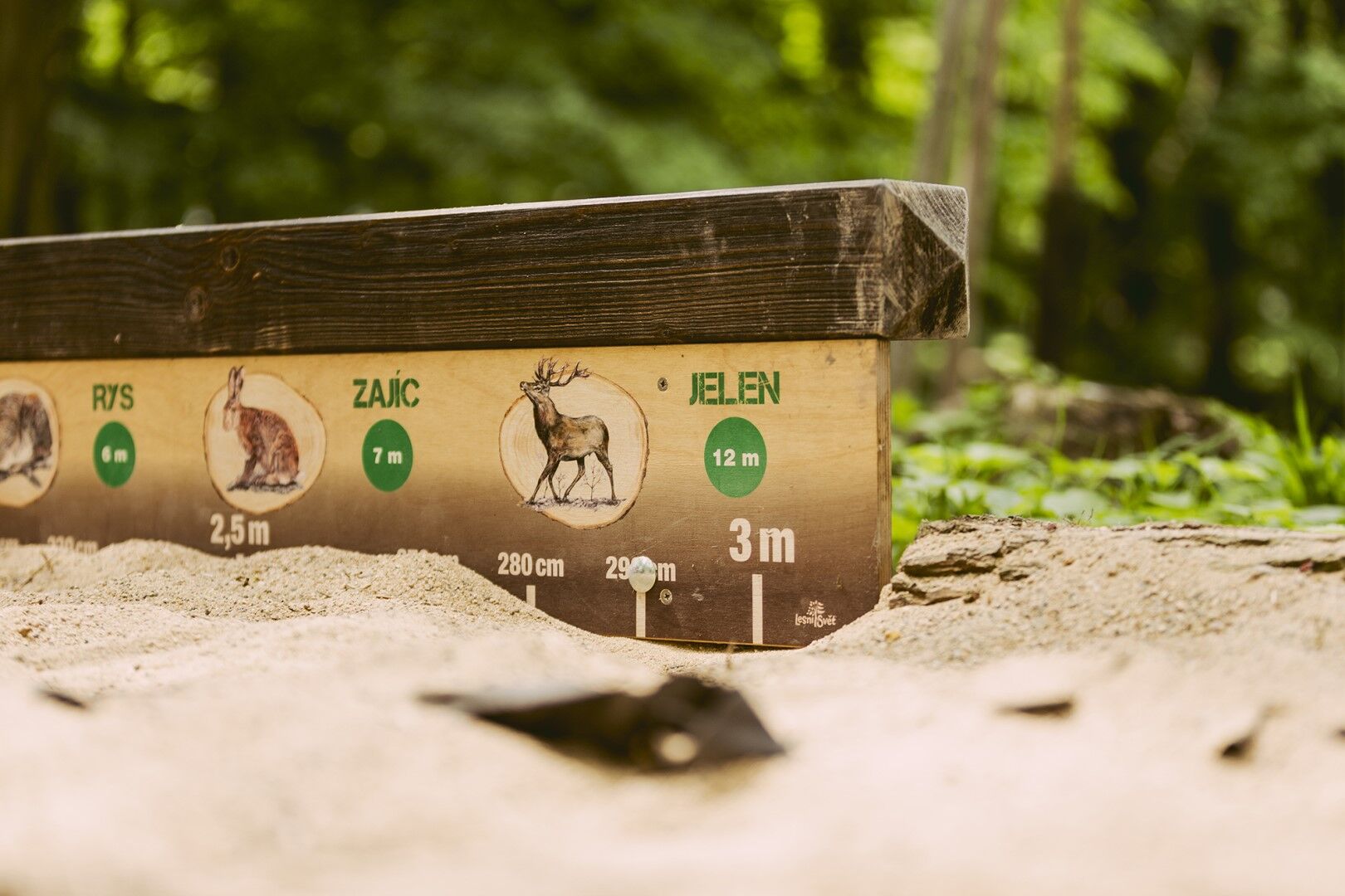 Vrchní část doskočiště funguje také jako kladina. Na doskočišti najdete ilustrace a délku skoku těchto zvířat: vrabec, blecha, kobylka, skokan, liška, kuna, veverka, rys, zajíc a jelen. K výrobě byl použit masivní smrkový KVH hranol s drásaným povrchem. Je tak mnohem odolnější. Dřevo pochází z našich lesů a má ekologický certifikát PEFC.