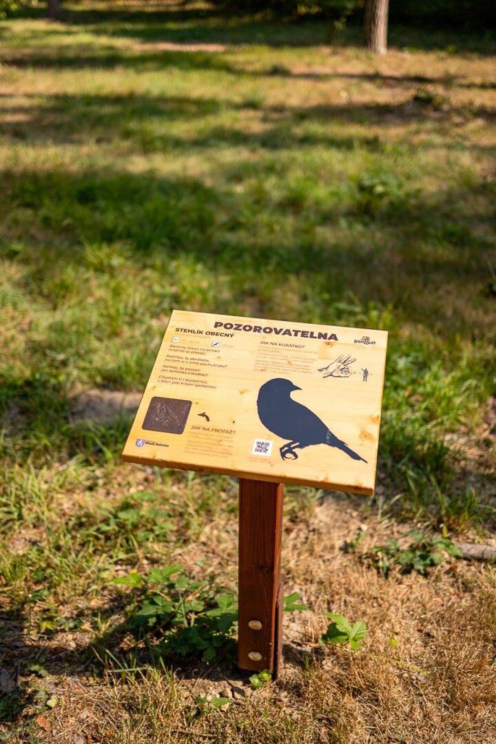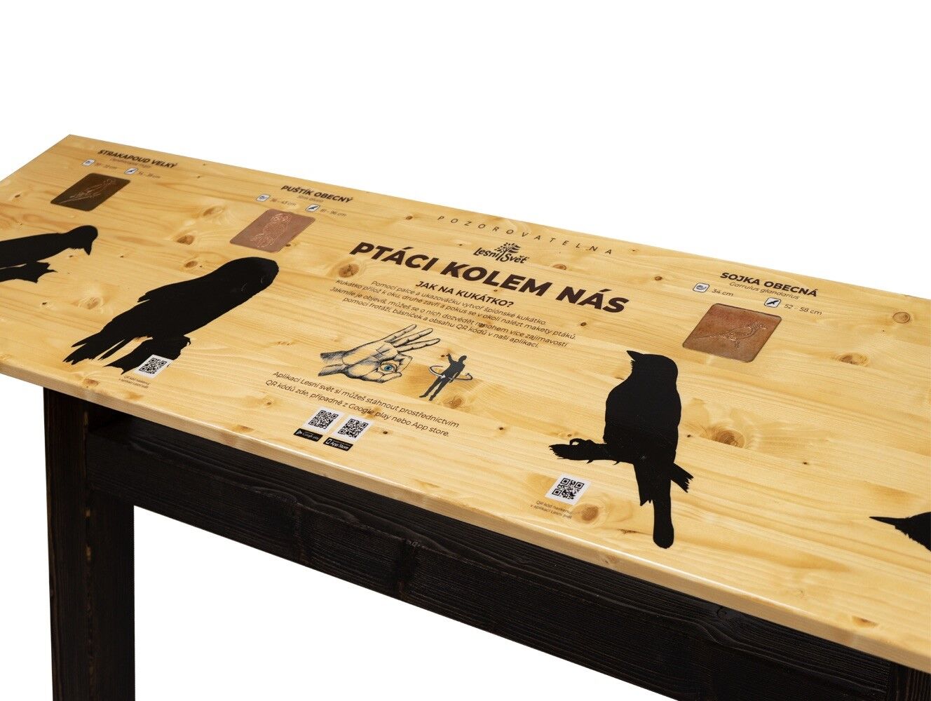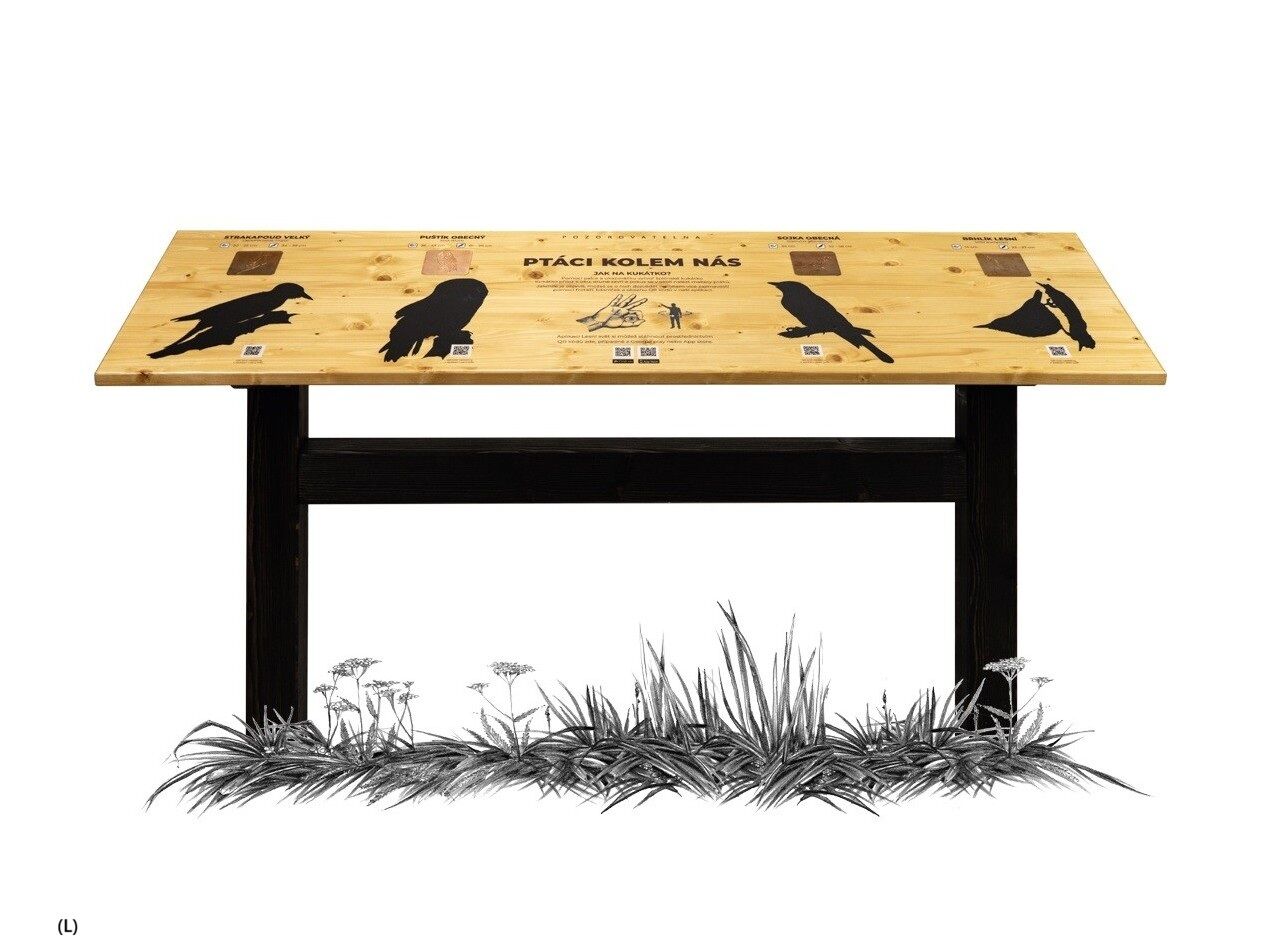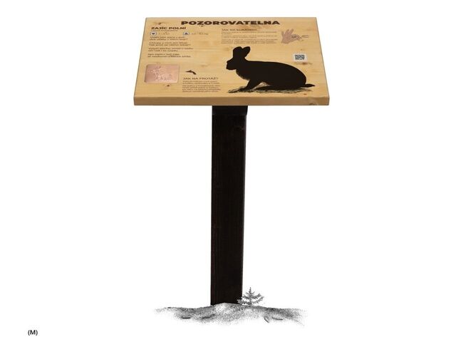 Naučný pult obsahuje frotáž, QR kód s hlasem zvířete, autorské ilustrace. Návštěvník si pomocí palce a ukazováčku vytvoří kukátko a hledá maketu. Navíc si může odnést otisk (frotáž) a zjistí hlas prostřednictvím aplikace a QR kódu. Prvek neobsahuje maketu zvířete. Tu si můžete vybrat dle Vašich představ. Téma pozorovatelen: PTÁCI, SAVCI. Frotáž je výtvarná technika přenosu obrázků z šablony na papír, kdy na šablonu položíte papír a obyčejnou tužkou po něm přejíždíte, až se obrázek objeví. Součástí prvku je kotvící materiál k zabetonování (ocelová kotva L, spojovací materiál, počet dle potřeb stojanu). Vyrobeno z masivního smrkového KVH hranolu a voděodolné překližky. Barvu nátěru konstrukce prvku si můžete zvolit dle vzorníku, který na přání zasíláme v elektronické podobě. Autorem kreseb jsou čeští ilustrátoři, obrázky jsou chráněny autorskými právy. Pozorovatelna je zapsána v rejstříku chráněných průmyslových vzorů EU. Prvky jsou vyrobeny z ekologicky certifikovaného dřeva PEFC.