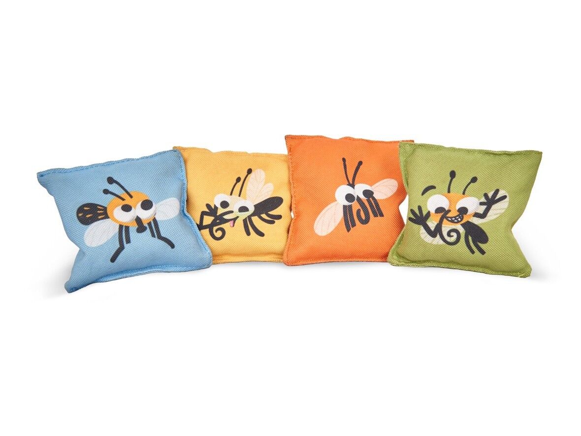 Zábavný prvek který prověří vaši mušku a trpělivost. Prvek je určený především do interiéru (trvalé umístění ve venkovním prostředí není vhodné). Prvek je mobilní - lze jej tedy přenášet. Součástí prvku jsou 3 sady házecích pytlíků s mouchami k prohazování. Každá sada obsahuje 4 pytlíčky v různých barvách - dohromady tedy 12 pytlíčků. Mohou tedy hrát 4 děti - každé dítě dostane 3 pytlíčky v jedné barvě a počítají si body podle toho, kolik much se jim podaří prohodit a do jaké díry - každá je jinak bodovaná. Vyrobeno z voděodolné překližky. Botky jsou z masivního smrkového KVH hranolu. Autorem kreseb jsou čeští ilustrátoři, obrázky jsou chráněny autorskými právy. Prvky jsou vyrobeny z ekologicky certifikovaného dřeva PEFC.