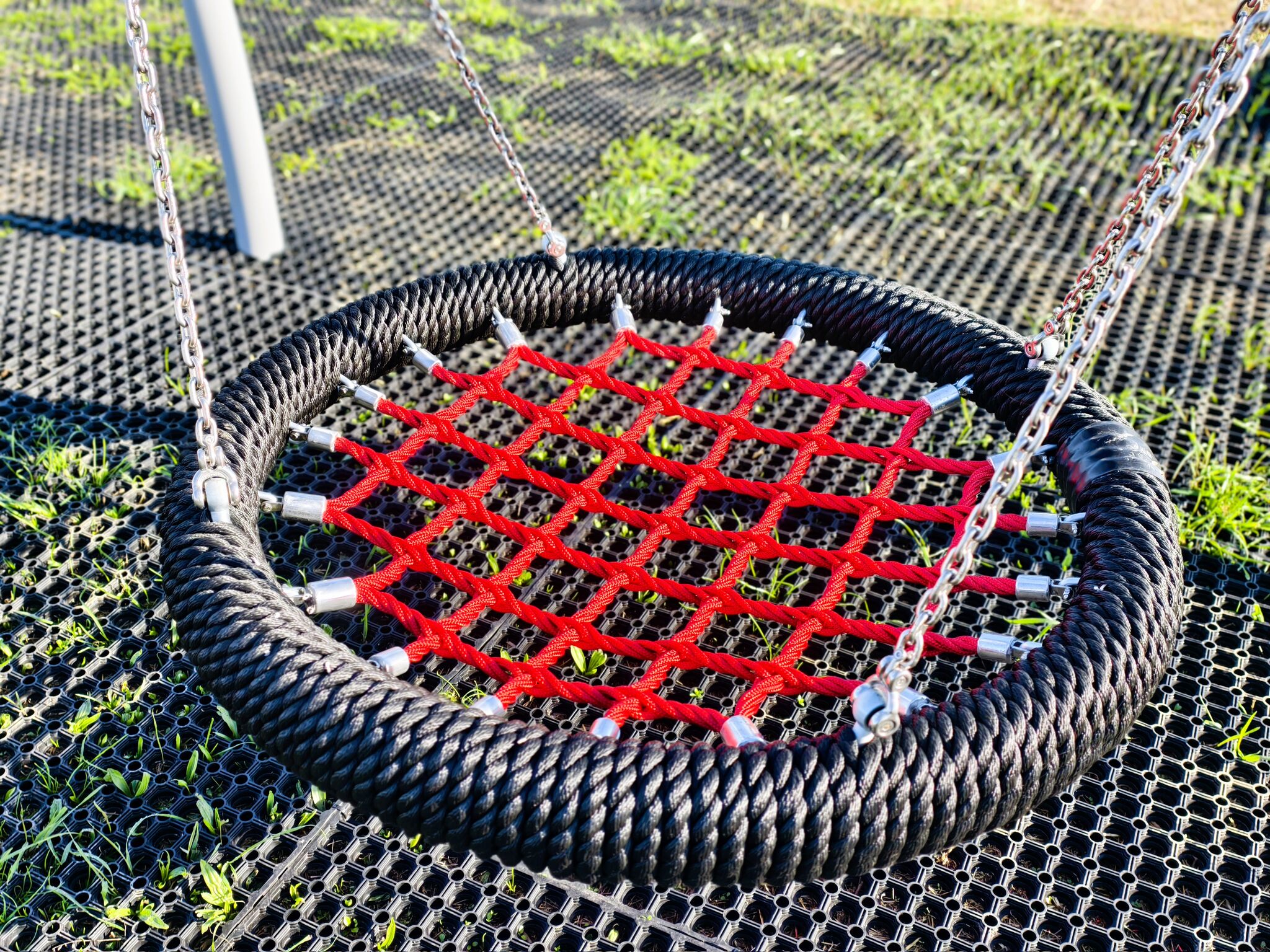 Sedátko typu „ptačí hnízdo“ o průměru 100 cm, zavěšené na 6 mm řetězech z nerezové oceli. Kovový rám potažený měkkým polypropylenovým lanem.