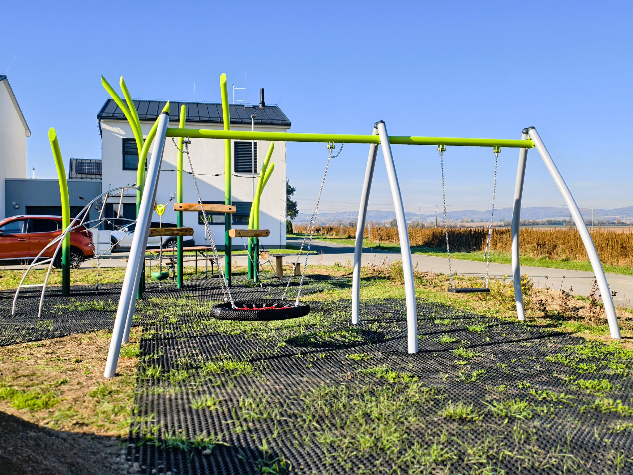 Sedadla mají hliníkovou konstrukci, jsou potažené měkkou EPDM pryží a zavěšené na 6 mm řetězích z nerezové oceli.