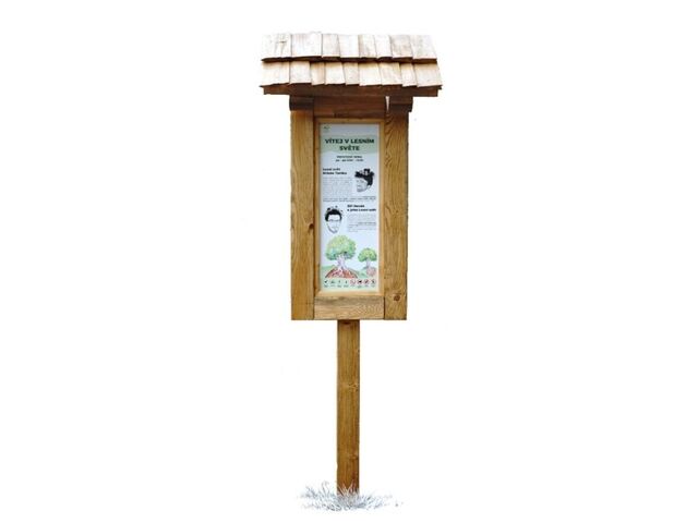 Jednoduchá naučná tabule, která napoví, kudy dál. Nabo i něco víc... Součástí prvku je kotvící materiál k zabetonování (ocelová kotva L, spojovací materiál, počet dle potřeb stojanu). Vyrobeno z masivního smrkového KVH hranolu a dibondu. Střecha je šindelová. Barvu nátěru konstrukce prvku si můžete zvolit dle vzorníku který na přání zasíláme v elektronické podobě. Autorem kreseb jsou čeští ilustrátoři, obrázky jsou chráněny autorskými právy. Prvky jsou vyrobeny z ekologicky certifikovaného dřeva PEFC.