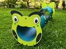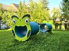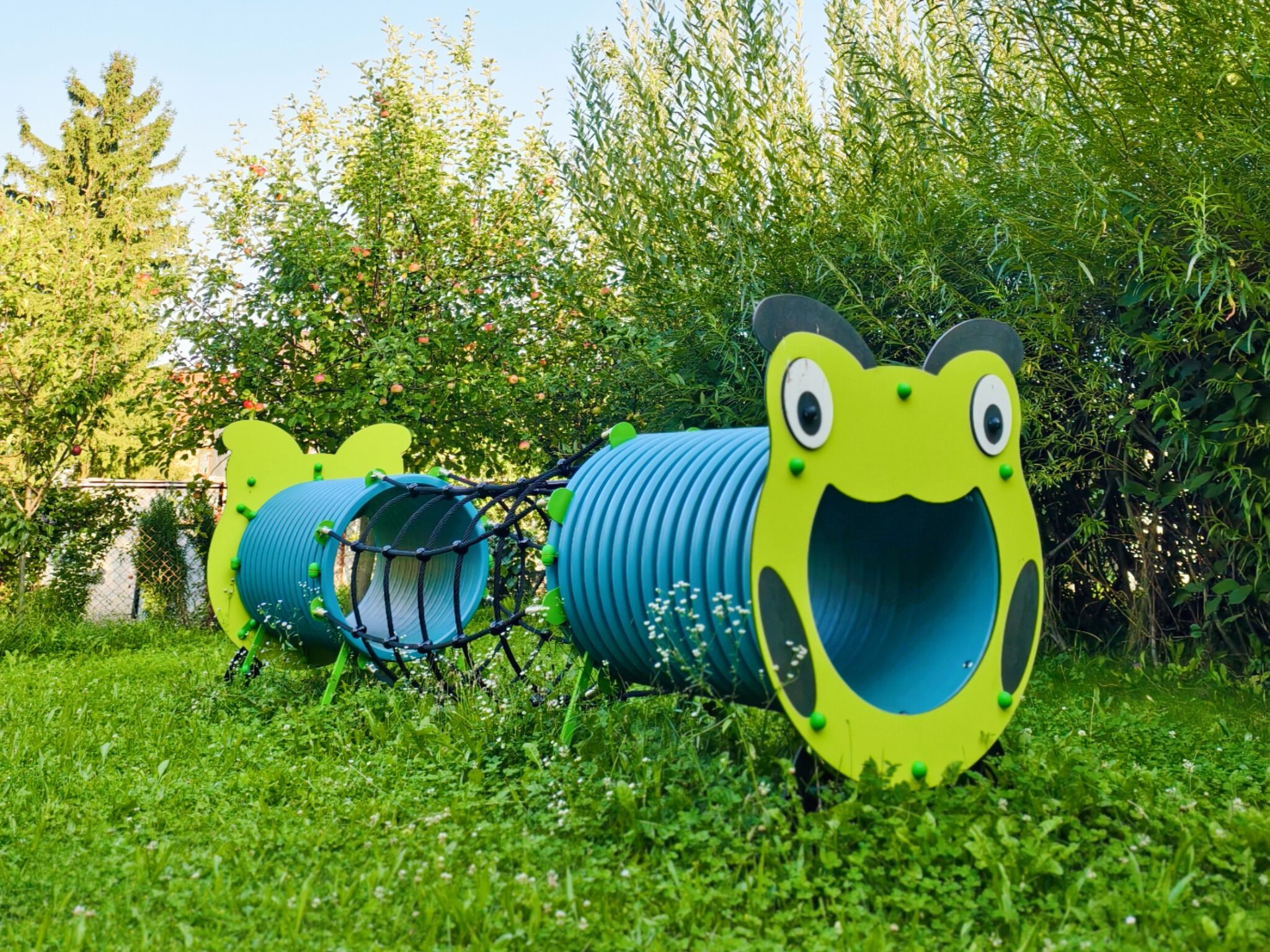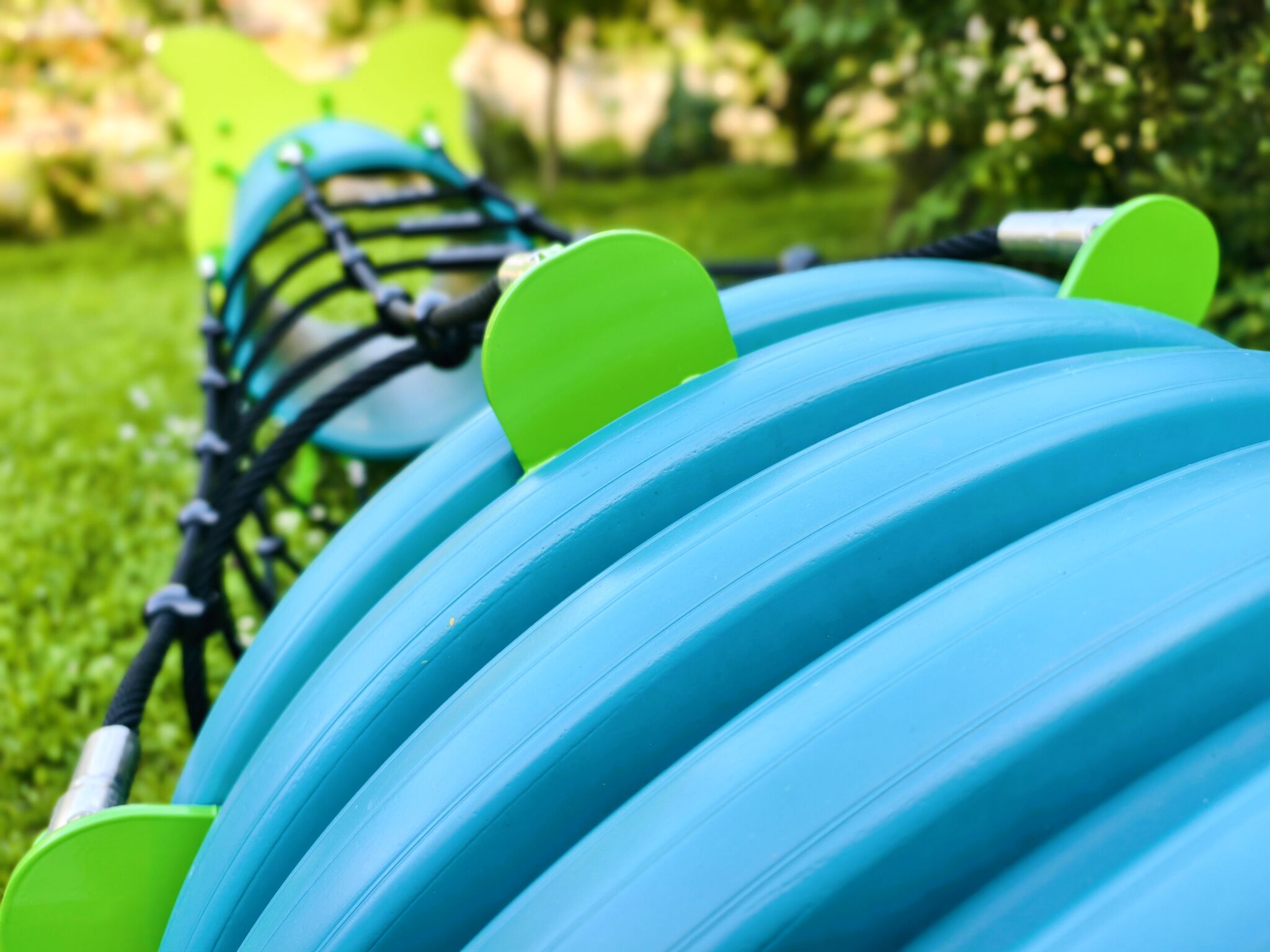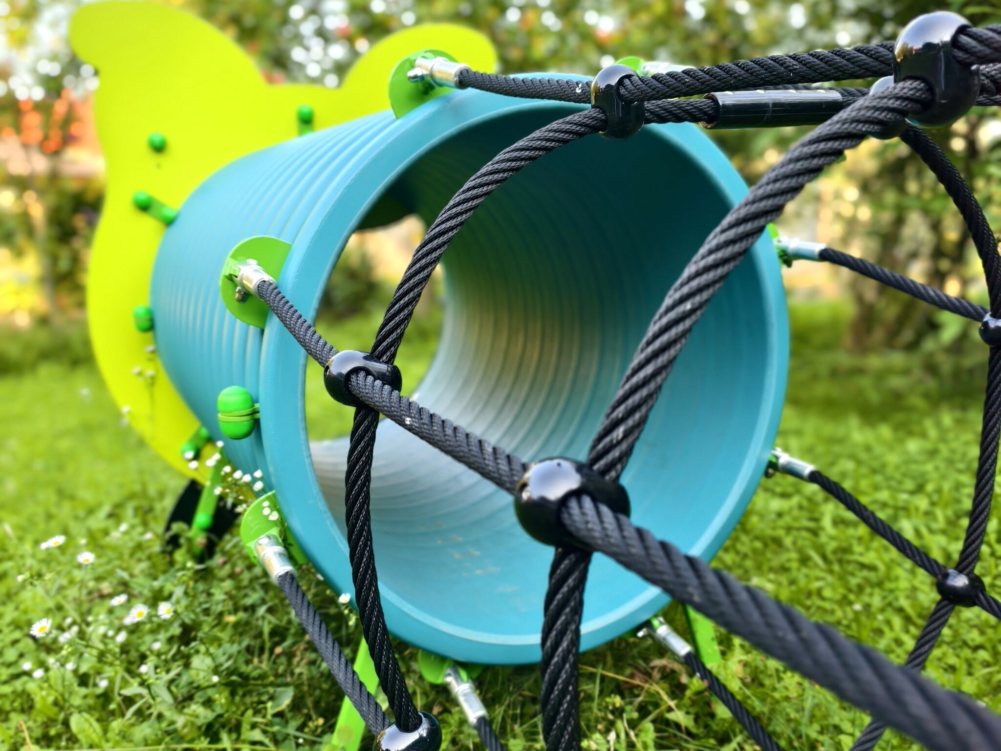 Herní prvek s motivem housenky a plastovým tunelem je naší střední verzí této řady herních prvků. Herní sestava se skládá ze dvou tunelů spojených lanovým tunelem. Tematický design podporuje dětskou představivost. Panely přední a zadní grafiky jsou vyrobeny z materiálu HPL, který je zárukou odolnosti, stálobarevnosti a bezpečnosti. Materiál HPL je šetrný k životnímu prostředí, odolný vůči chemikáliím, UV záření, netoxický, recyklovatelný a nerozbitný. Nehrozí, že by se děti poranily o ostré hrany nebo střepy. Lana jsou vyrobena z polyesterových vláken, která jsou navinuta kolem středu. Tato konstrukce lana zvyšuje jeho pevnost a odolnost vůči mechanickému namáhání. Samotný polyester má mnoho pozitivních vlastností. Je odolný vůči mikroorganismům, povětrnostním vlivům, rychle schne po dešti, je stálobarevný a vyznačuje se vysokou pevností. Spojovací prvky jsou z nerezové oceli.