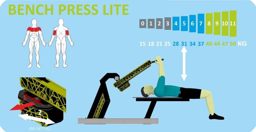 Venkovní posilovnu nabízíme ve dvou variantách obtížnosti závaží viz. obrázky (LITE a HEAVY). Možnost více barevných variant. Venkovní posilovna Bench Press je určena pro komplexní trénink svalových partií venku bez nutnosti přenosných závaží nebo elektrického pohonu. Díky své konstrukci umožňuje bezpečné a efektivní cvičení s vlastní vahou nebo s využitím vestavěných odporových prvků. Cvičením na tomto zařízení posilujete horní i dolní část těla, střed těla i stabilizační svalstvo.
