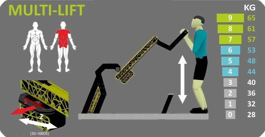 Konstrukce je navržena tak, aby splňovala standardy pro venkovní sportovní vybavení (EN16630). Venkovní posilovna Multi‑Lift je profesionální outdoor fitness zařízení navržené pro komunitní prostory, veřejná prostranství, parky a rekreační zóny. Je součástí řady robustních venkovních posilovacích strojů, které jsou vyrobeny s důrazem na odolnost vůči povětrnostním vlivům, bezpečnost a dlouhodobou životnost. Univerzální tréninkový stroj vhodný pro širokou škálu uživatelů – od začátečníků až po zkušené sportovce. Dlouhodobá odolnost i při každodenním používání ve venkovním prostředí. Bezpečné a stabilní konstrukční prvky pro trénink bez rizika rychlého opotřebení.