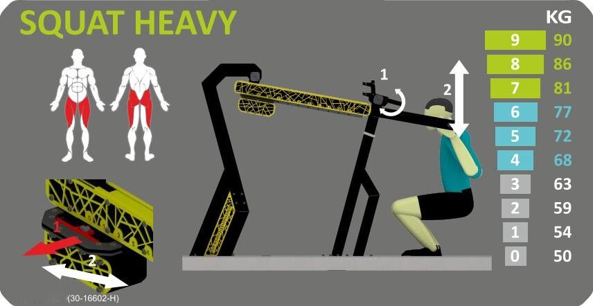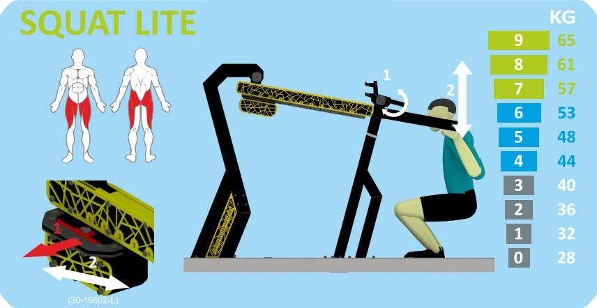 Konstrukce je navržena tak, aby splňovala standardy pro venkovní sportovní vybavení (EN16630). Venkovní posilovna Squat je profesionální outdoor fitness zařízení navržené pro komunitní prostory, veřejná prostranství, parky a rekreační zóny. Je součástí řady robustních venkovních posilovacích strojů, které jsou vyrobeny s důrazem na odolnost vůči povětrnostním vlivům, bezpečnost a dlouhodobou životnost. Univerzální tréninkový stroj vhodný pro širokou škálu uživatelů – od začátečníků až po zkušené sportovce. Dlouhodobá odolnost i při každodenním používání ve venkovním prostředí. Bezpečné a stabilní konstrukční prvky pro trénink bez rizika rychlého opotřebení.