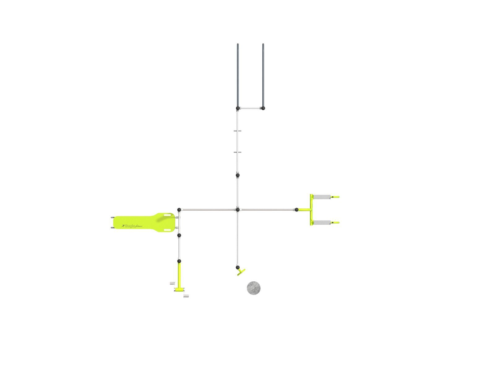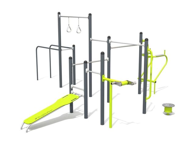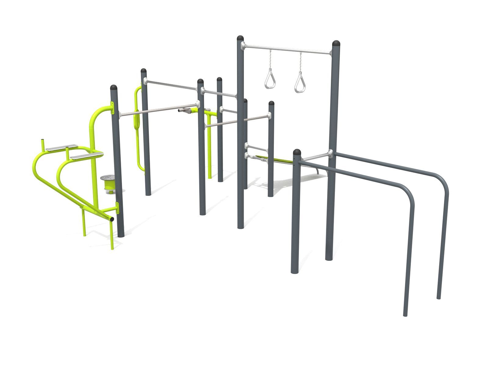 5x hrazda, 2x madlo k přitahování, 1x fitness lavice, 1x bradla, 1x posilovací stroj horních končetin, 1x bradla s opěrkami, 1x twister