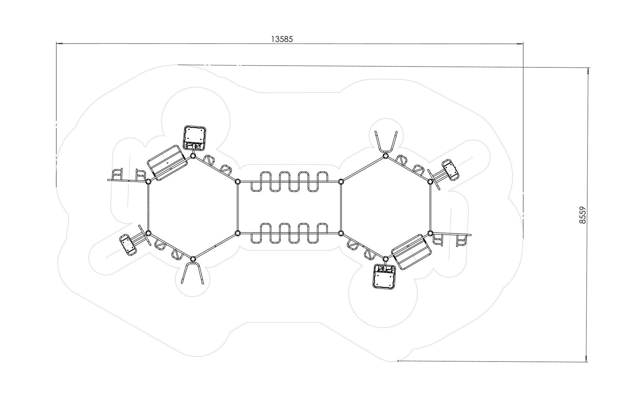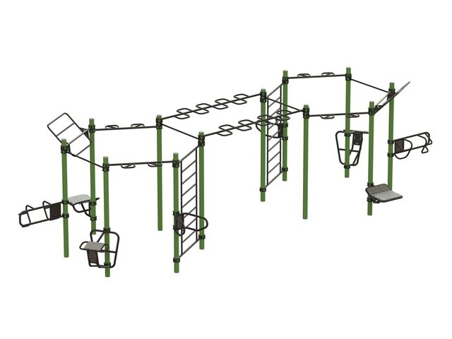 2x šikmý žebřík, 2x polymetrická deska, 4x víceúchopová hrazda, 2x lavice sed-leh, 2x paralelní bradla, 2x horizontální žebřík, 2x vertikální žebřík, 4x hrazda, 2x bradla