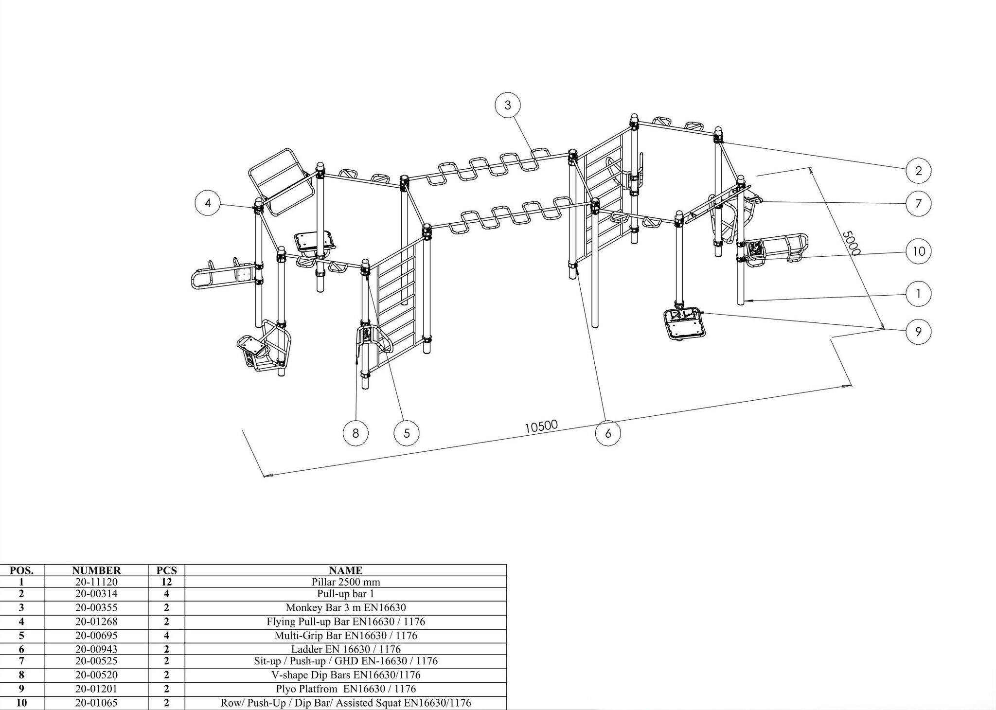 Multifunkční tréninkový prvek navržený pro venkovní cvičení s vlastním tělem, vhodný pro veřejné workout parky a fit zóny, městské parky, školy, sportoviště, komunitní a rekreační prostory. Prvek je odolný vůči povětrnostním vlivům a splňuje evropské bezpečnostní normy. Použitý materiál je odolný vůči vlhkosti, slunečnímu záření a opotřebení, což snižuje potřebu časté údržby.